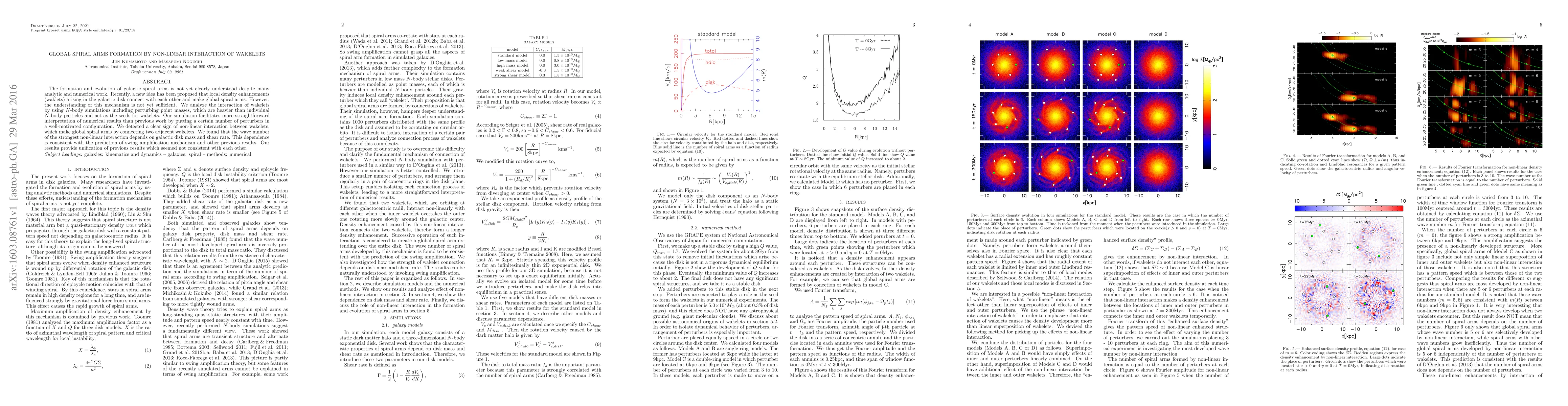 The formation and evolution of galactic spiral arms is not yet clearly understood despite many analytic and numerical work. Recently, a new idea has been proposed that local density enhancements (waklets) arising in the galactic disk connect with each other and make global spiral arms. However, the understanding of this mechanism is not yet sufficient. We analyze the interaction of wakelets by using N-body simulations including perturbing point masses, which are heavier than individual N-body particles and act as the seeds for wakelets. Our simulation facilitates more straightforward interpretation of numerical results than previous work by putting a certain number of perturbers in a well-motivated configuration. We detected a clear sign of non-linear interaction between wakelets, which make global spiral arms by connecting two adjacent wakelets. We found that the wave number of the strongest non-linear interaction depends on galactic disk mass and shear rate. This dependence is consistent with the prediction of swing amplification mechanism and other previous results. Our results provide unification of previous results which seemed not consistent with each other.
