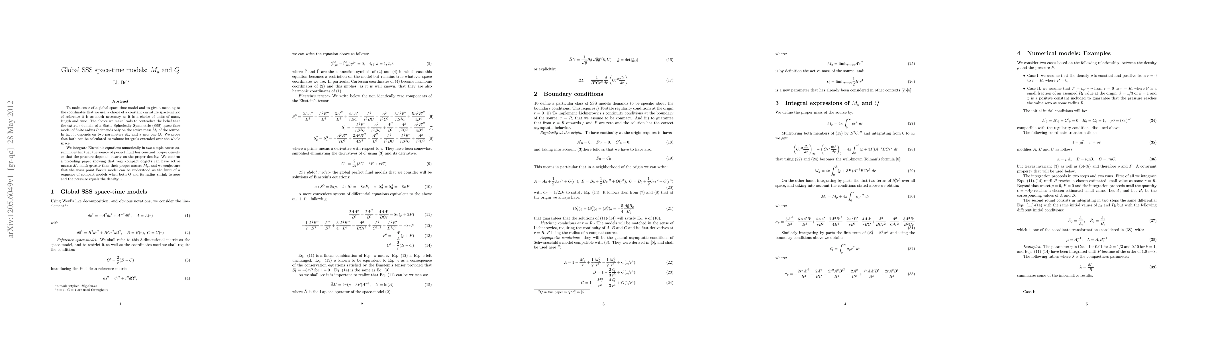 To make sense of a global space-time model and to give a meaning to the coordinates that we use, a choice of a constant curvature space-metric of reference it is as much necessary as it is a choice of units of mass, length and time. The choice we make leads to contradict the belief that the exterior domain of a Static Spherically Symmetric (SSS) space-time model of finite radius $R$ depends only on the active mass $M_a$ of the source. In fact it depends on two parameters $M_a$ and a new one $Q$. We prove that both can be calculated as volume integrals extended over the whole space. We integrate Einstein's equations numerically in two simple cases: assuming either that the source of perfect fluid has constant proper density or that the pressure depends linearly on the proper density. We confirm a preceding paper showing that very compact objects can have active masses $M_a$ much greater than their proper masses $M_p$, and we conjecture that the mass point Fock's model can be understood as the limit of a sequence of compact models when both Q and its radius shrink to zero and the pressure equals the density.