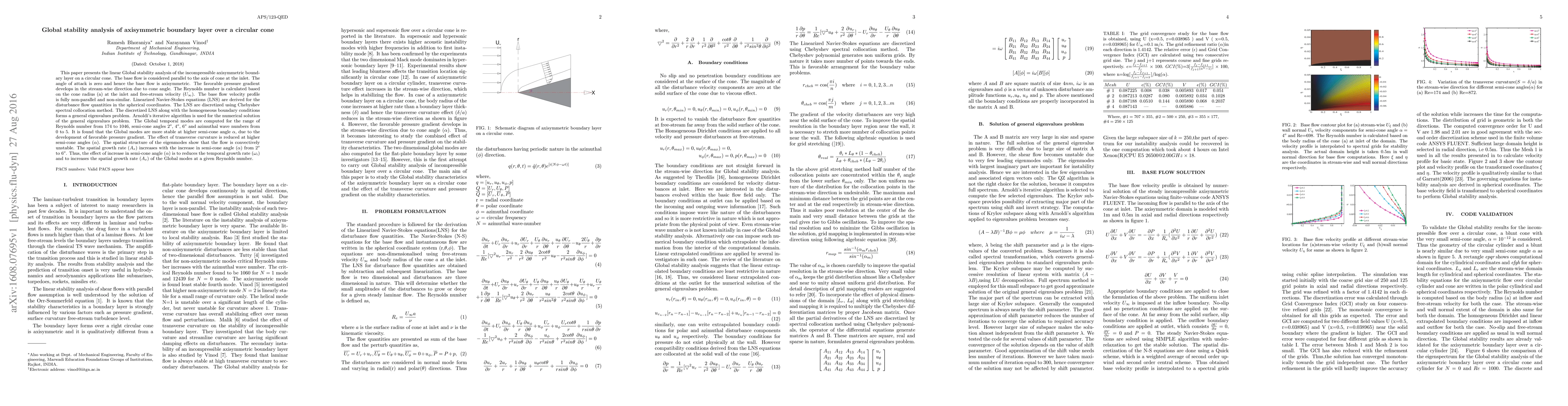 This paper presents the linear Global stability analysis of the incompressible axisymmetric boundary layer on a circular cone. The base flow is considered parallel to the axis of cone at the inlet. The angle of attack is zero and hence the base flow is axisymmetric. The favorable pressure gradient develops in the stream-wise direction due to cone angle. The Reynolds number is calculated based on the cone radius (a) at the inlet and free-stream velocity ($U_{\infty}$). The base flow velocity profile is fully non-parallel and non-similar. Linearized Navier-Stokes equations (LNS) are derived for the disturbance flow quantities in the spherical coordinates. The LNS are discretized using Chebyshev spectral collocation method. The discretized LNS along with the homogeneous boundary conditions forms a general eigenvalues problem. Arnoldi's iterative algorithm is used for the numerical solution of the general eigenvalues problem. The Global temporal modes are computed for the range of Reynolds number from 174 to 1046, semi-cone angles $2^o$, $4^o$, $6^o$ and azimuthal wave numbers from 0 to 5. It is found that the Global modes are more stable at higher semi-cone angle $\alpha$, due to the development of favorable pressure gradient. The effect of transverse curvature is reduced at higher semi-cone angles ($\alpha$). The spatial structure of the eigenmodes show that the flow is convectively unstable. The spatial growth rate ($A_x$) increases with the increase in semi-cone angle ($\alpha$) from $2^o$ to $6^o$. Thus, the effect of increase in semi-cone angle ($\alpha$) is to reduces the temporal growth rate ($\omega_i$) and to increases the spatial growth rate ($A_x$) of the Global modes at a given Reynolds number.