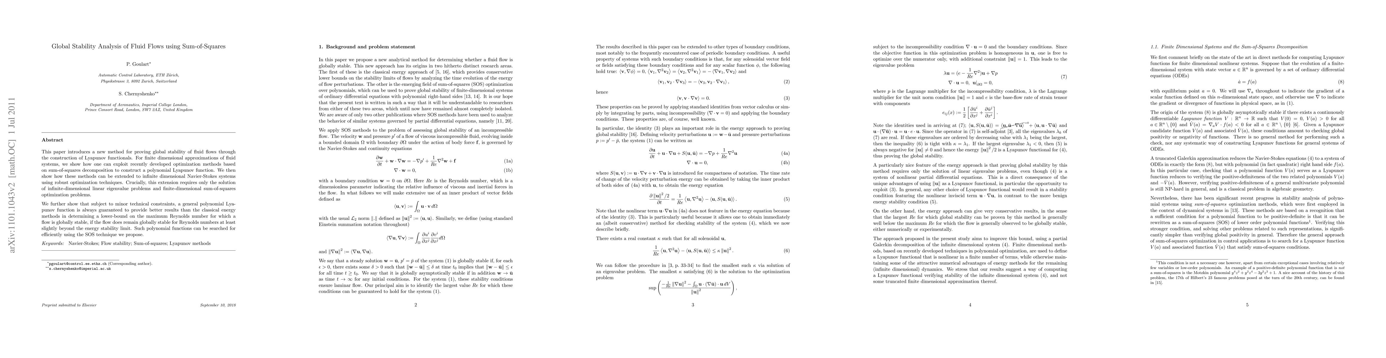 This paper develops a new method using sum-of-squares optimization to construct polynomial Lyapunov functions for proving global stability in fluid flows, extending the approach from finite-dimensional to infinite-dimensional Navier-Stokes systems. The proposed method provides better stability bounds compared to classical energy methods.