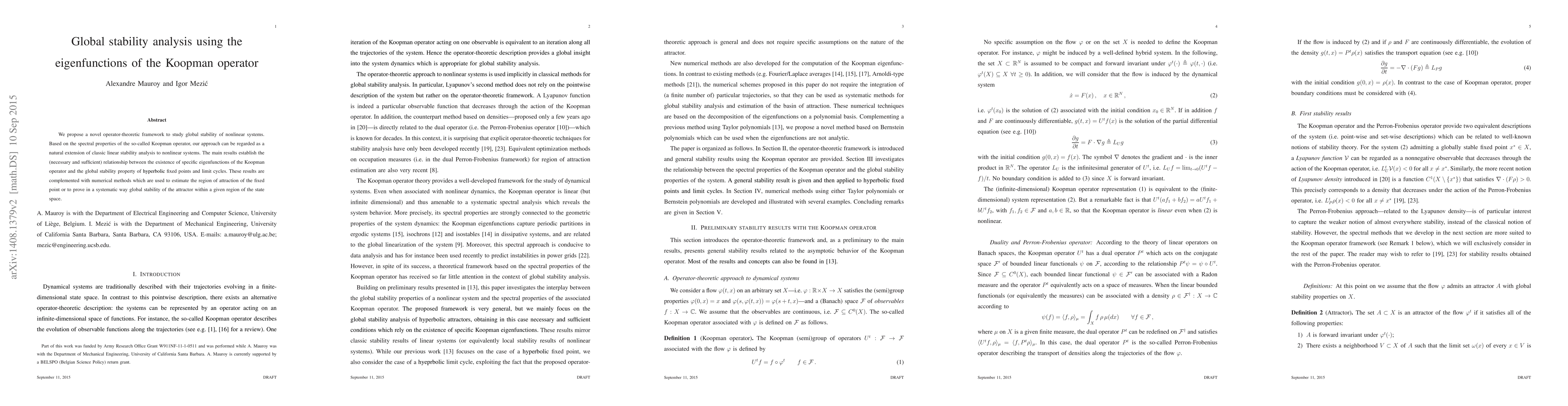 We propose a novel operator-theoretic framework to study global stability of nonlinear systems. Based on the spectral properties of the so-called Koopman operator, our approach can be regarded as a natural extension of classic linear stability analysis to nonlinear systems. The main results establish the (necessary and sufficient) relationship between the existence of specific eigenfunctions of the Koopman operator and the global stability property of hyperbolic fixed points and limit cycles. These results are complemented with numerical methods which are used to estimate the region of attraction of the fixed point or to prove in a systematic way global stability of the attractor within a given region of the state space.