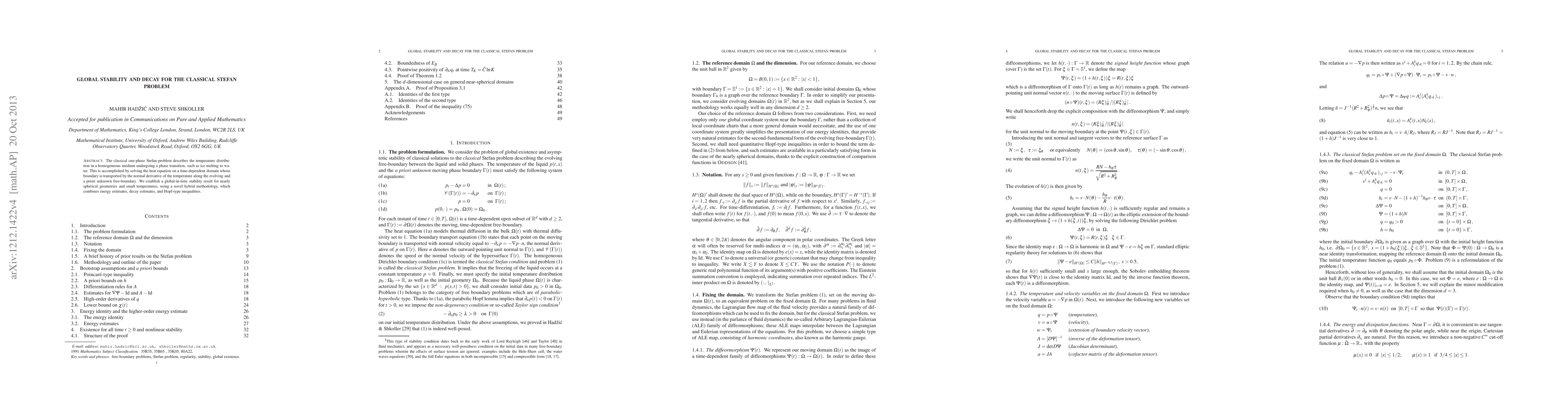 Researchers established global stability for the classical Stefan problem in nearly spherical geometries with small temperatures, using a novel hybrid methodology combining energy estimates, decay estimates, and Hopf-type inequalities.