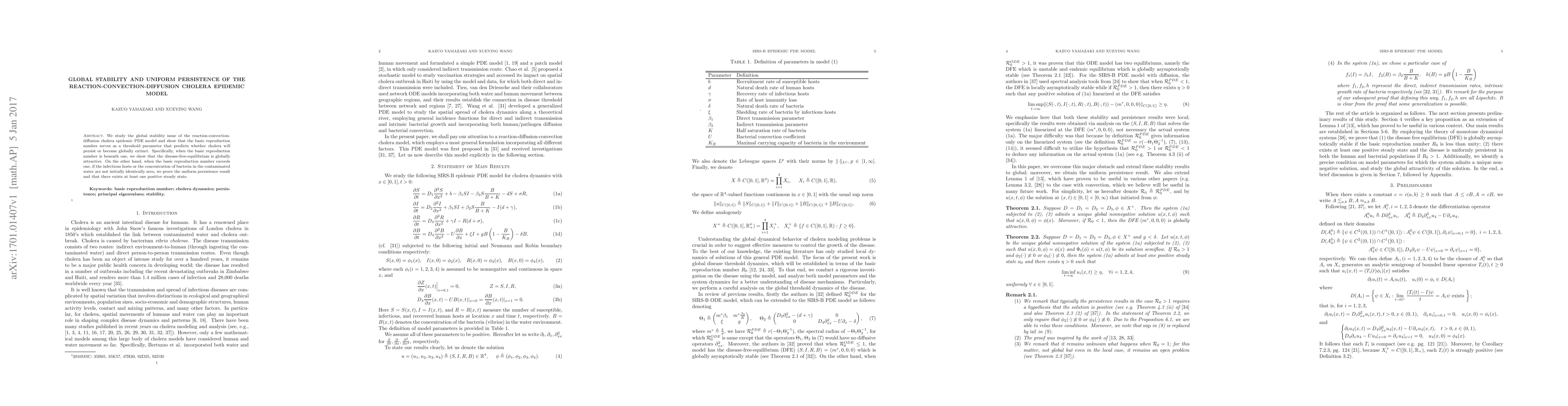 This paper investigates the global stability and uniform persistence of a reaction-convection-diffusion cholera epidemic model. It demonstrates that the basic reproduction number acts as a threshold determining whether cholera persists or dies out, with global attractiveness of the disease-free equilibrium when the reproduction number is below one.