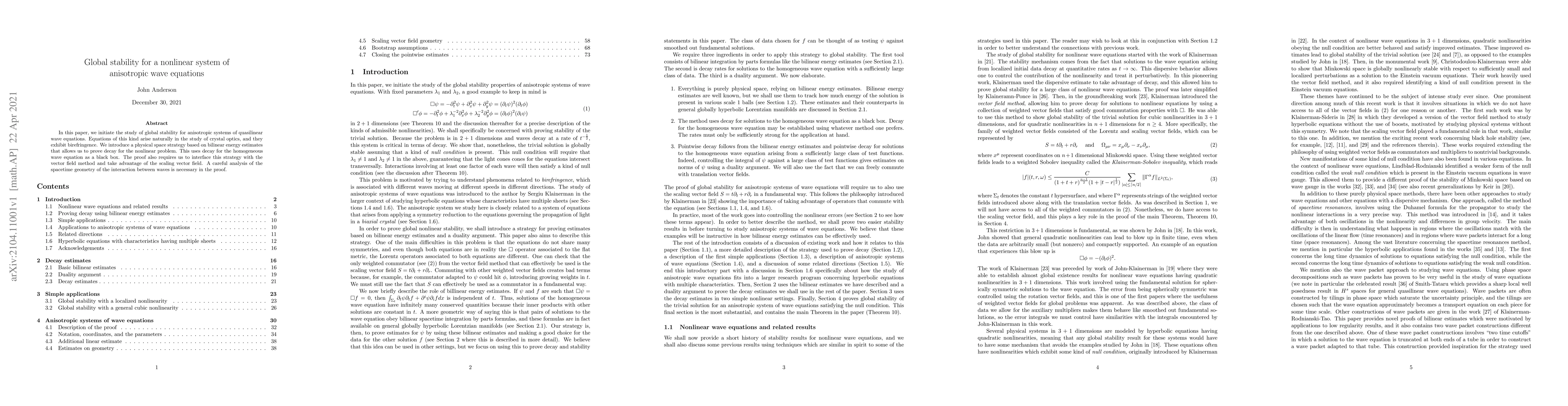 This paper investigates global stability for anisotropic quasilinear wave equations, which model phenomena like birefringence in crystal optics. The authors employ a physical space strategy with bilinear energy estimates, integrating the vector field method and scaling vector field to achieve decay results, leveraging the decay properties of the homogeneous wave equation.