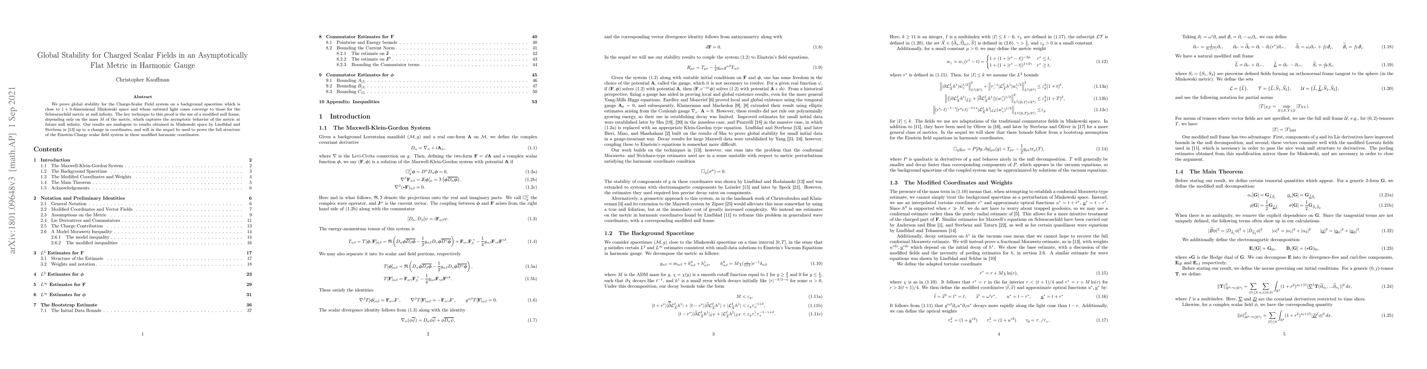 We prove global stability for the Charge-Scalar Field system on a background spacetime which is close to $1+3$-dimensional Minkowski space and whose outward light cones converge to those for the Schwarzschild metric at null infinity. The key technique to this proof is the use of a modified null frame, depending only on the mass $M$ of the metric, which captures the asymptotic behavior of the metric at future null infinity. Our results are analogous to results obtained in Minkowski space by Lindblad and Sterbenz up to a change in coordinates, and will in the sequel be used to prove the full structure of the Einstein-Charge scalar field system in these modified harmonic coordinates.
