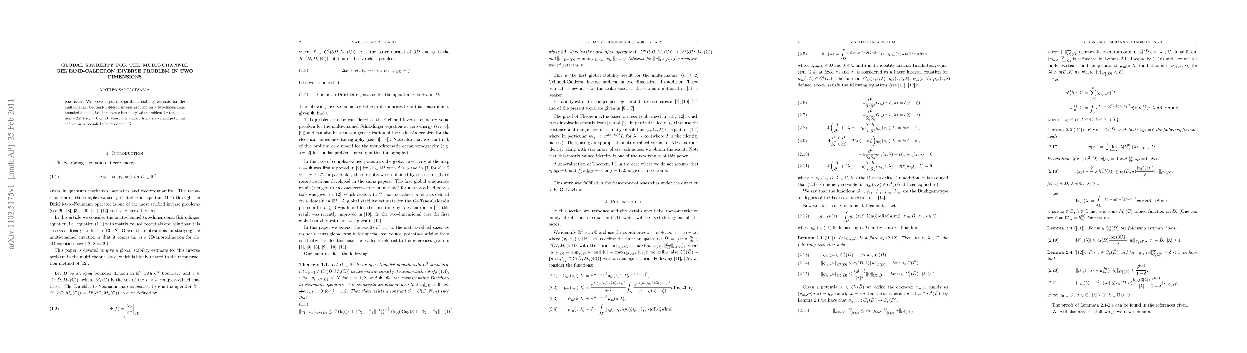 This paper establishes a global logarithmic stability estimate for the multi-channel Gel'fand-Calderón inverse problem in two dimensions, addressing the boundary value problem for the equation $-\Delta \psi + v\, \psi = 0$ within a bounded domain, where $v$ is a smooth matrix-valued potential.