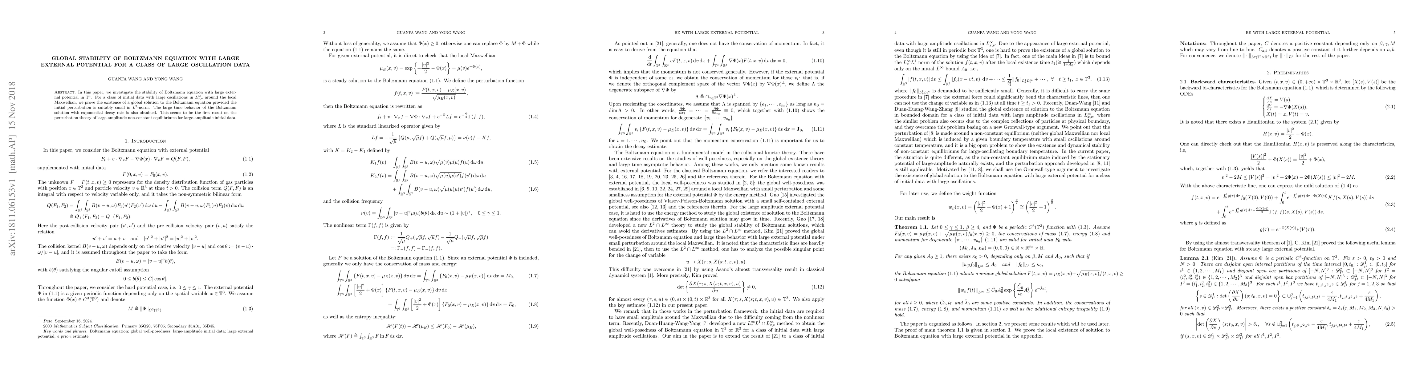 This paper proves global stability of the Boltzmann equation under large external potentials, showing existence of a global solution for initial data with large oscillations, provided the perturbation is small in $L^2$-norm. It also establishes an exponential decay rate for the solution's large time behavior.