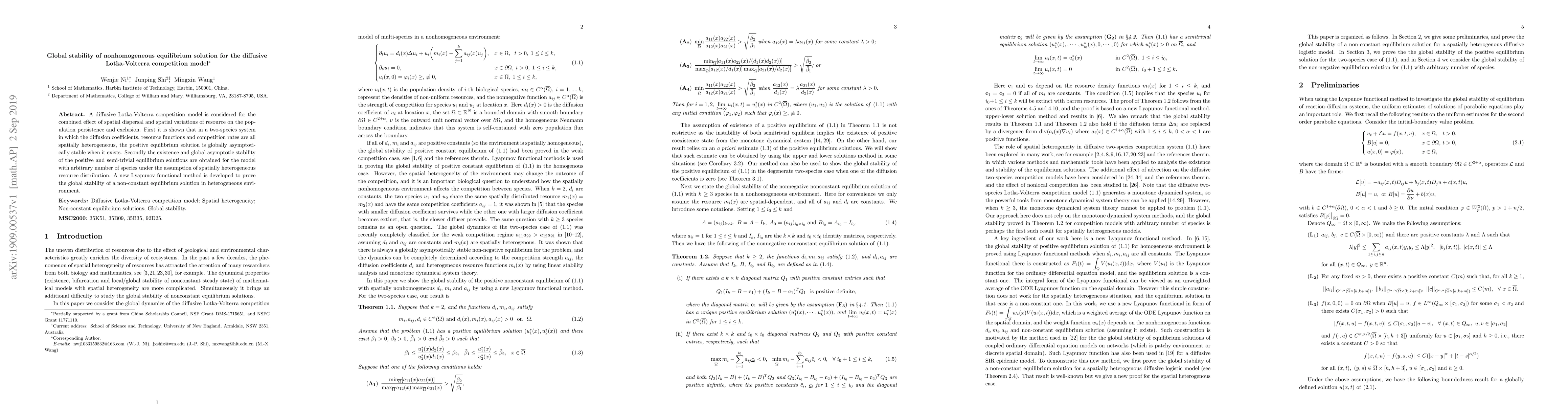 This paper investigates the global stability of nonhomogeneous equilibrium solutions in a diffusive Lotka-Volterra competition model, demonstrating that spatially heterogeneous diffusion coefficients, resource functions, and competition rates lead to globally asymptotically stable positive equilibria in two-species systems. A new Lyapunov functional method is introduced to prove the global stability of non-constant equilibria in models with any number of species under heterogeneous resource distribution.