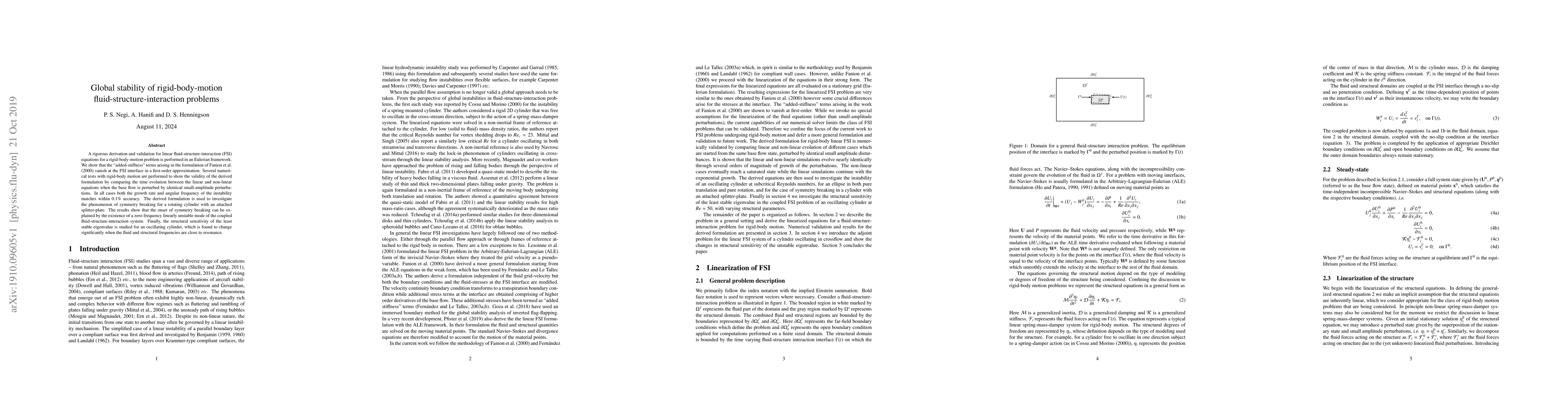 This paper rigorously derives and validates linear fluid-structure-interaction equations for rigid-body-motion problems, showing that added-stiffness terms vanish at the FSI interface. Numerical tests confirm the accuracy of the derived formulation, revealing the phenomenon of symmetry breaking and the structural sensitivity of the least stable eigenvalue near resonance.