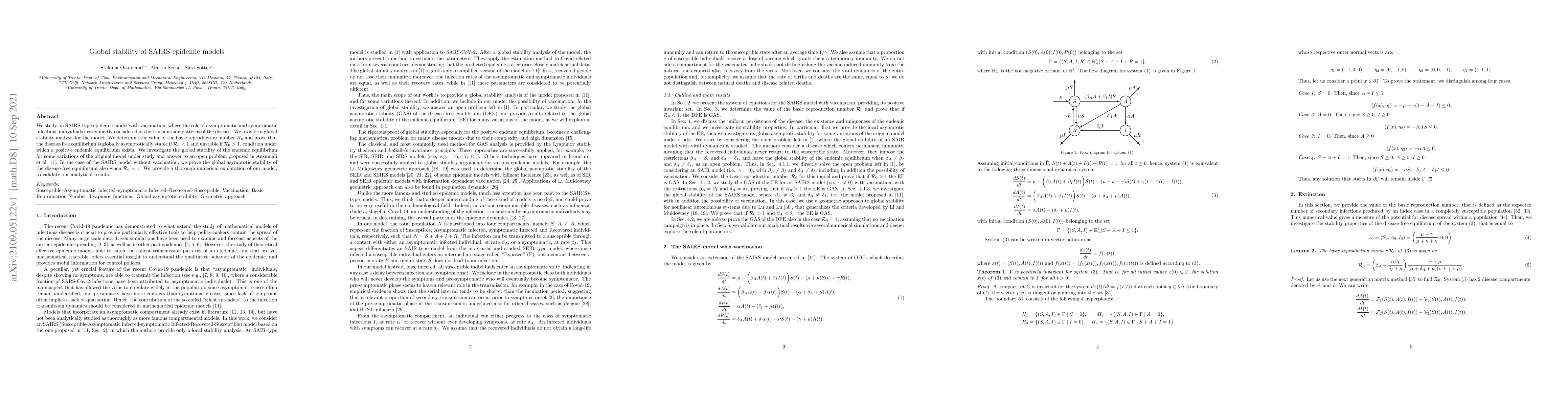 We study an SAIRS-type epidemic model with vaccination, where the role of asymptomatic and symptomatic infectious individuals are explicitly considered in the transmission patterns of the disease. We provide a global stability analysis for the model. We determine the value of the basic reproduction number $\mathcal{R}_0$ and prove that the disease-free equilibrium is globally asymptotically stable if $\mathcal{R}_0<1$ and unstable if $\mathcal{R}_0>1$, condition under which a positive endemic equilibrium exists. We investigate the global stability of the endemic equilibrium for some variations of the original model under study and answer to an open problem proposed in Ansumali et al. \cite{ansumali2020modelling}. In the case of the SAIRS model without vaccination, we prove the global asymptotic stability of the disease-free equilibrium also when $\mathcal{R}_0=1$. We provide a thorough numerical exploration of our model, to validate our analytical results.