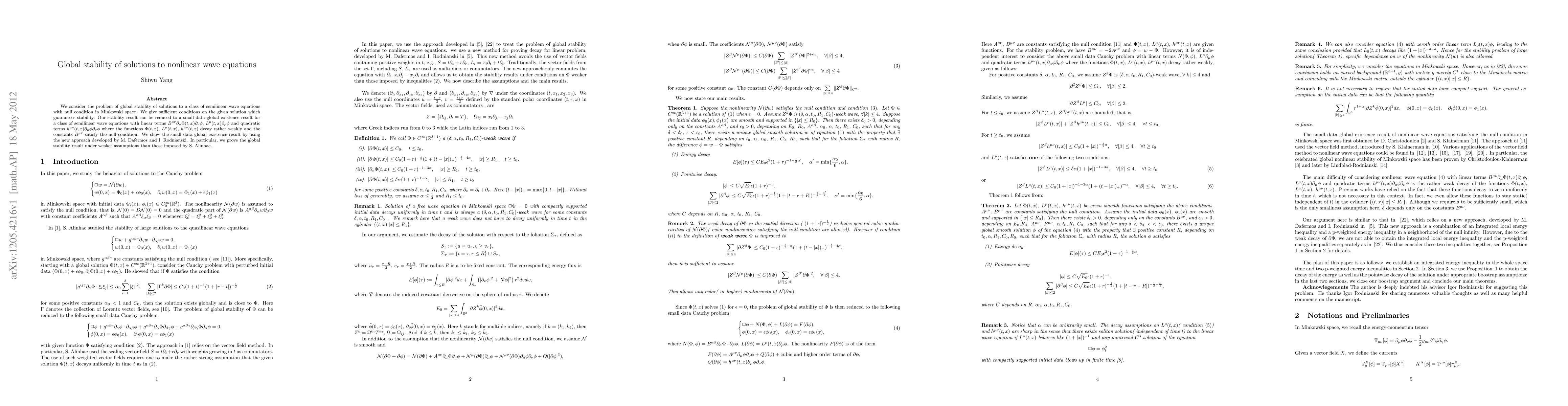 This paper investigates the global stability of solutions to semilinear wave equations with null conditions in Minkowski space, providing sufficient conditions for stability. The authors utilize a new approach by Dafermos and Rodnianski to demonstrate small data global existence and global stability under weaker assumptions than previously required.