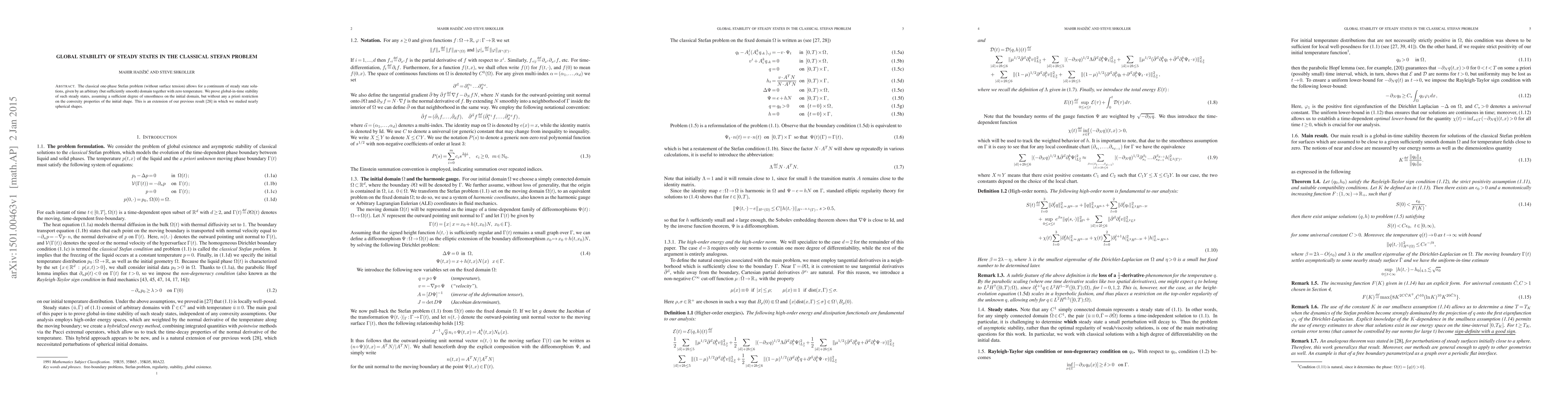 The classical one-phase Stefan problem (without surface tension) allows for a continuum of steady state solutions, given by an arbitrary (but sufficiently smooth) domain together with zero temperature. We prove global-in-time stability of such steady states, assuming a sufficient degree of smoothness on the initial domain, but without any a priori restriction on the convexity properties of the initial shape. This is an extension of our previous result [28] in which we studied nearly spherical shapes.