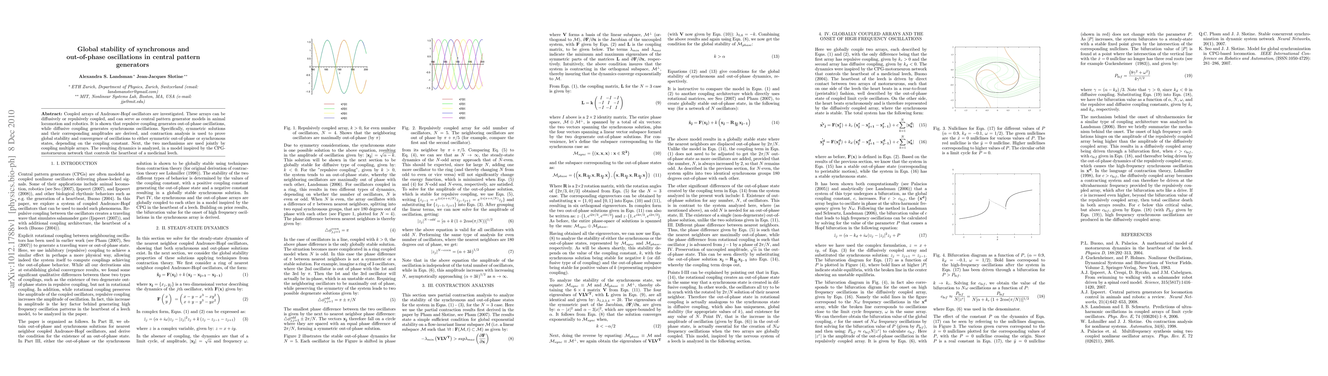 Coupled arrays of Andronov-Hopf oscillators are investigated. These arrays can be diffusively or repulsively coupled, and can serve as central pattern generator models in animal locomotion and robotics. It is shown that repulsive coupling generates out-of-phase oscillations, while diffusive coupling generates synchronous oscillations. Specifically, symmetric solutions and their corresponding amplitudes are derived, and contraction analysis is used to prove global stability and convergence of oscillations to either symmetric out-of-phase or synchronous states, depending on the coupling constant. Next, the two mechanisms are used jointly by coupling multiple arrays. The resulting dynamics is analyzed, in a model inspired by the CPG-motorneuron network that controls the heartbeat of a medicinal leech.