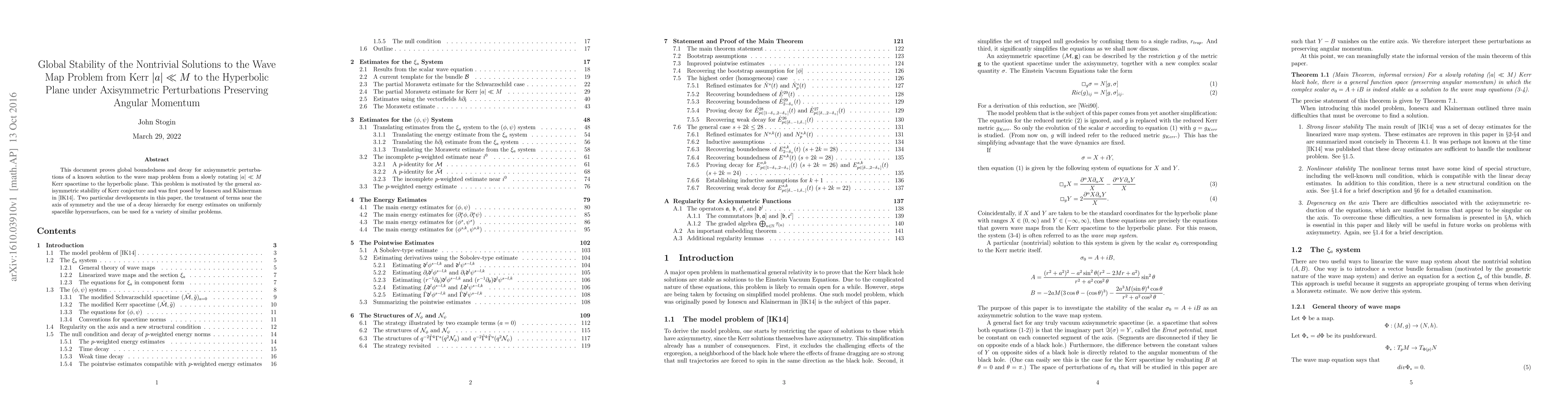 This document proves global boundedness and decay for axisymmetric perturbations of a known solution to the wave map problem from a slowly rotating $|a|\ll M$ Kerr spacetime to the hyperbolic plane. This problem is motivated by the general axisymmetric stability of Kerr conjecture and was first posed by Ionescu and Klainerman in [IK14]. Two particular developments in this paper, the treatment of terms near the axis of symmetry and the use of a decay hierarchy for energy estimates on uniformly spacelike hypersurfaces, can be used for a variety of similar problems.