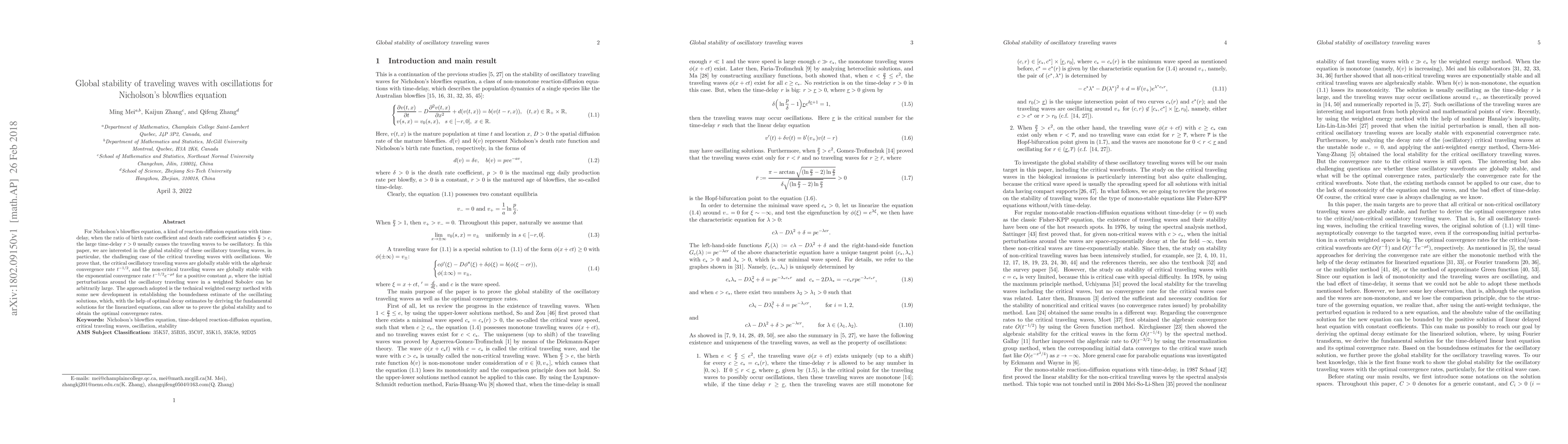 This paper investigates the global stability of oscillatory traveling waves in Nicholson's blowflies equation, demonstrating that critical waves converge algebraically while non-critical waves converge exponentially, using a novel weighted energy method and optimal decay estimates.