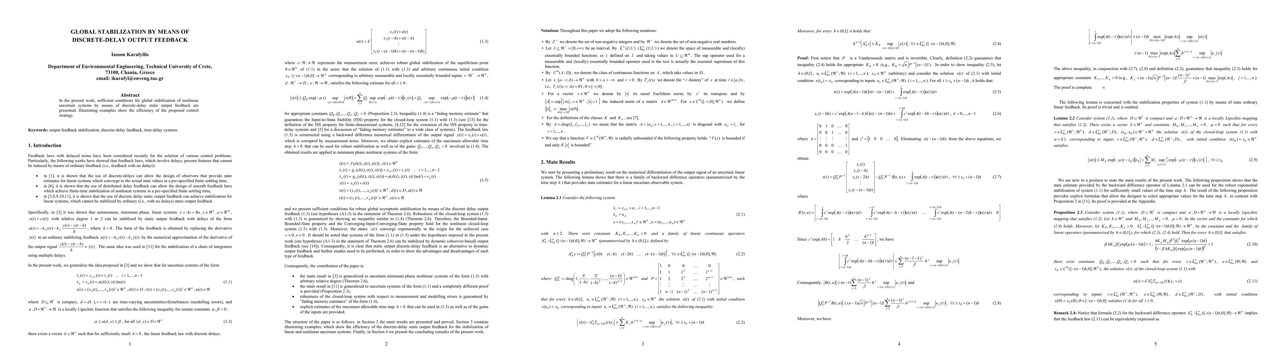 This paper presents sufficient conditions for global stabilization of nonlinear uncertain systems using discrete-delay static output feedback. Illustrative examples demonstrate the effectiveness of the proposed control strategy.