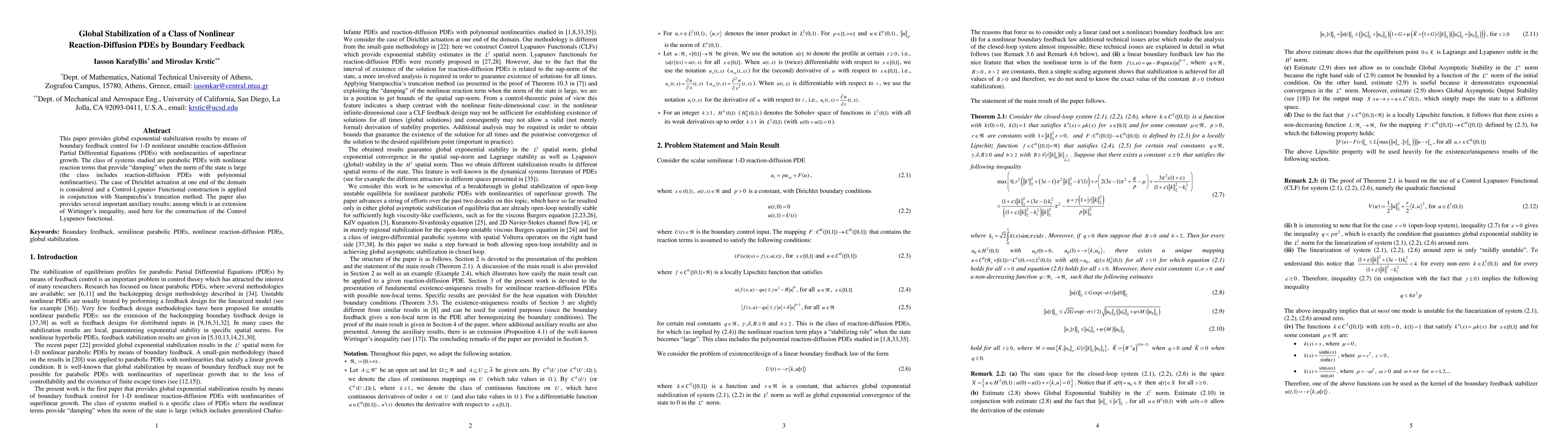 This paper provides global exponential stabilization results by means of boundary feedback control for 1-D nonlinear unstable reaction-diffusion Partial Differential Equations (PDEs) with nonlinearities of superlinear growth. The class of systems studied are parabolic PDEs with nonlinear reaction terms that provide "damping" when the norm of the state is large (the class includes reaction-diffusion PDEs with polynomial nonlinearities). The case of Dirichlet actuation at one end of the domain is considered and a Control-Lypunov Functional construction is applied in conjunction with Stampacchia's truncation method. The paper also provides several important auxiliary results; among which is an extension of Wirtinger's inequality, used here for the construction of the Control Lyapunov functional.