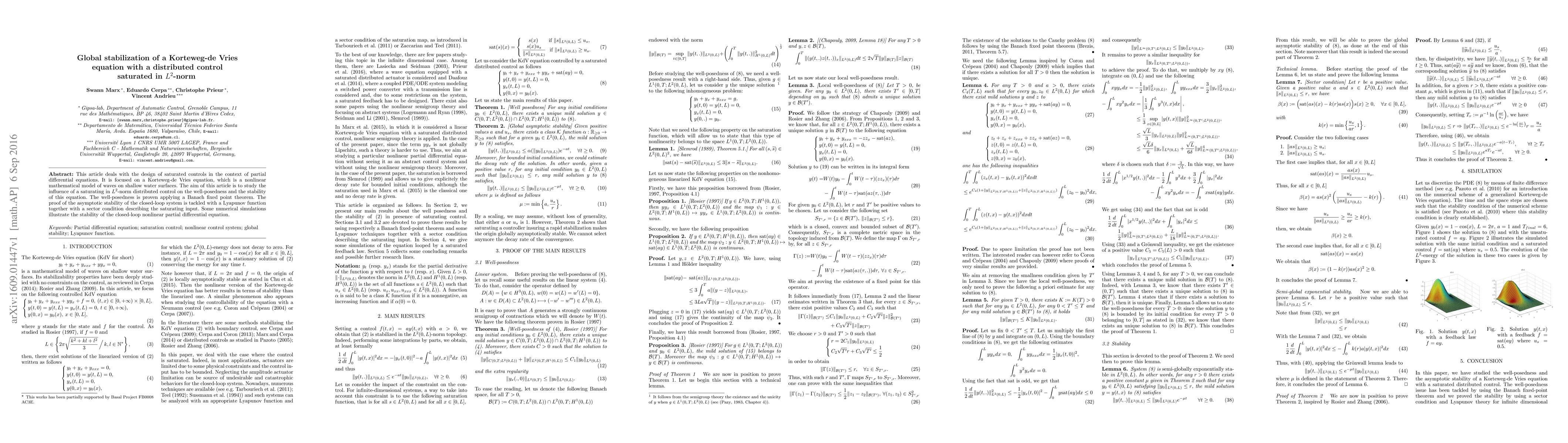 This article deals with the design of saturated controls in the context of partial differential equations. It is focused on a Korteweg-de Vries equation, which is a nonlinear mathematical model of waves on shallow water surfaces. The aim of this article is to study the influence of a saturating in L 2-norm distributed control on the well-posedness and the stability of this equation. The well-posedness is proven applying a Banach fixed point theorem. The proof of the asymptotic stability of the closed-loop system is tackled with a Lyapunov function together with a sector condition describing the saturating input. Some numerical simulations illustrate the stability of the closed-loop nonlinear partial differential equation.