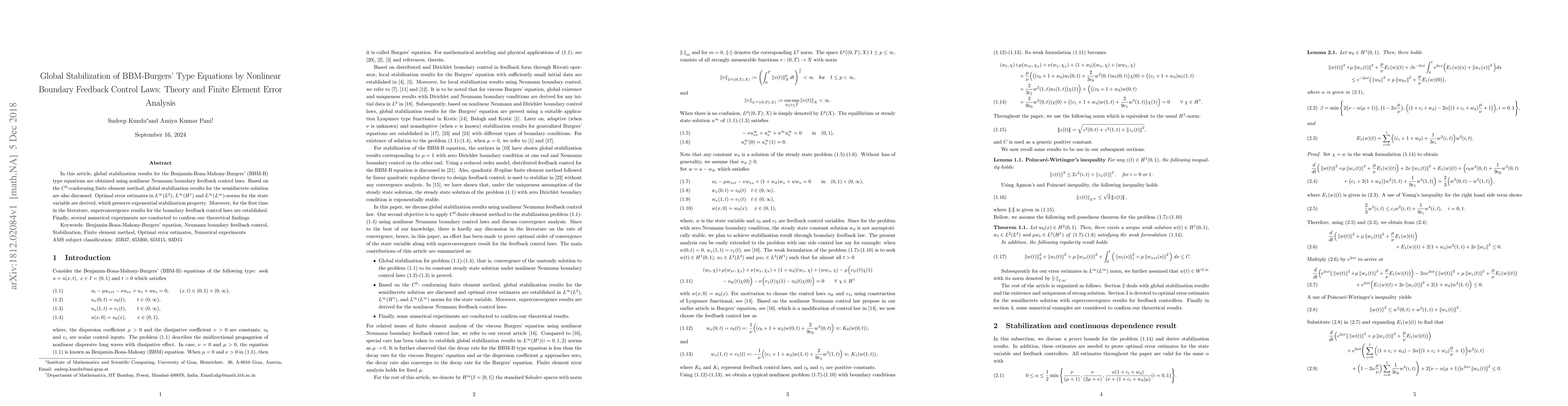 This paper presents global stabilization for BBM-Burgers' type equations via nonlinear boundary feedback control, with finite element analysis confirming the exponential stabilization property and introducing superconvergence results for boundary control laws. Numerical experiments validate the theoretical results.