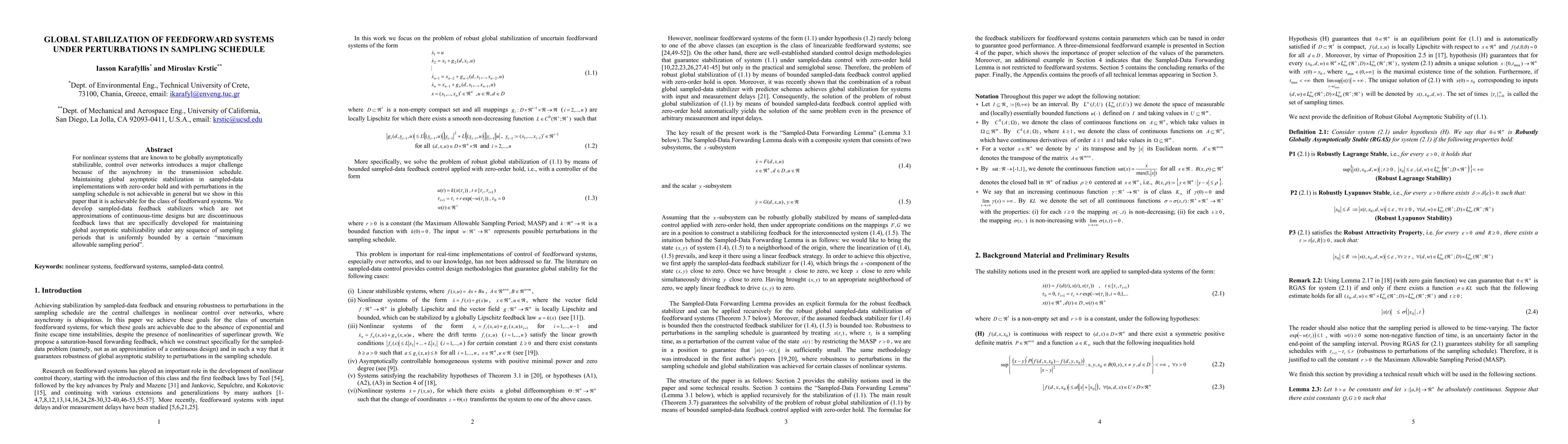 This paper presents a method to globally stabilize feedforward systems under perturbations in sampling schedules, demonstrating that global asymptotic stabilization is achievable despite asynchrony in network-based control. The proposed solution involves developing specific discontinuous feedback laws tailored to maintain stability under uniformly bounded sampling periods.