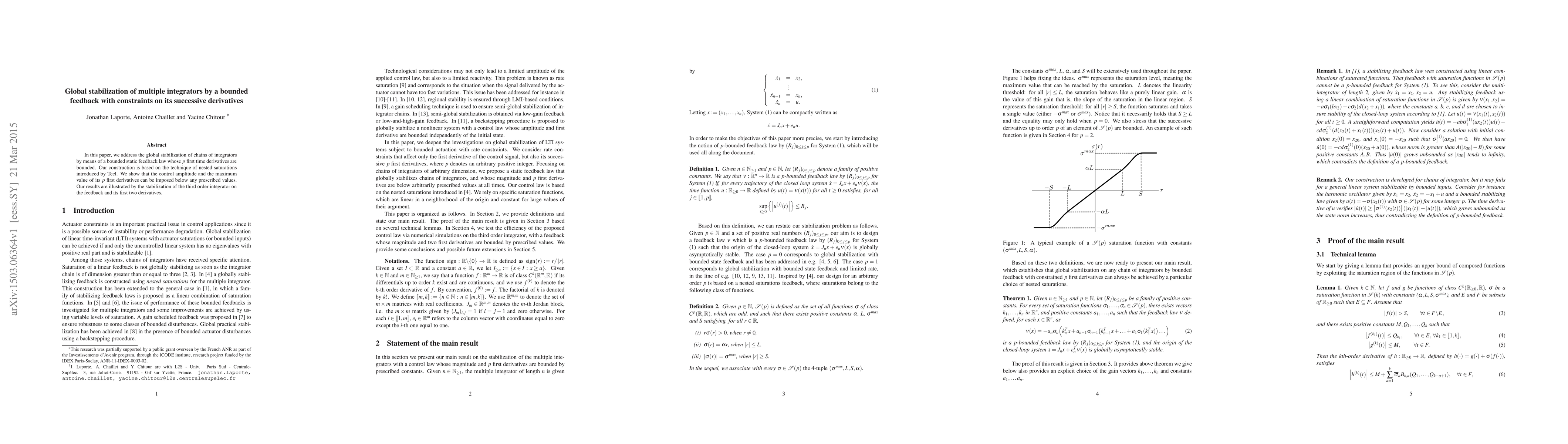 This paper presents a method for globally stabilizing chains of integrators using a bounded static feedback law with constraints on the first p derivatives. The technique employs nested saturations to ensure the control amplitude and derivative bounds can be set below any specified values, demonstrated through the stabilization of a third-order integrator.