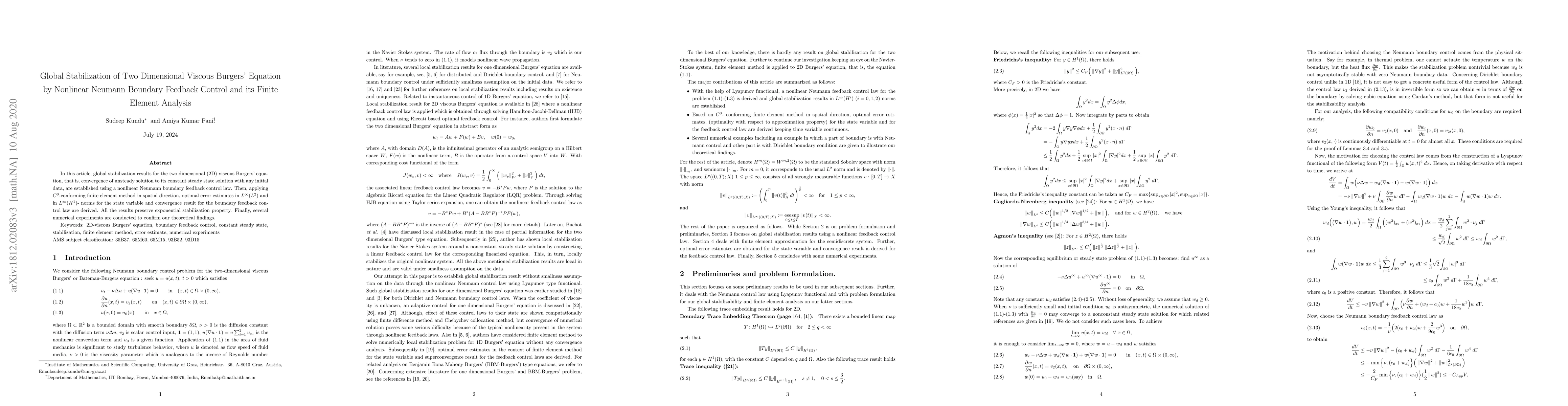 This paper establishes global stabilization for the 2D viscous Burgers' equation using a nonlinear Neumann boundary feedback control law, ensuring convergence to a steady state. It also employs a $C^0$-conforming finite element method to derive optimal error estimates and confirm theoretical results through numerical experiments.