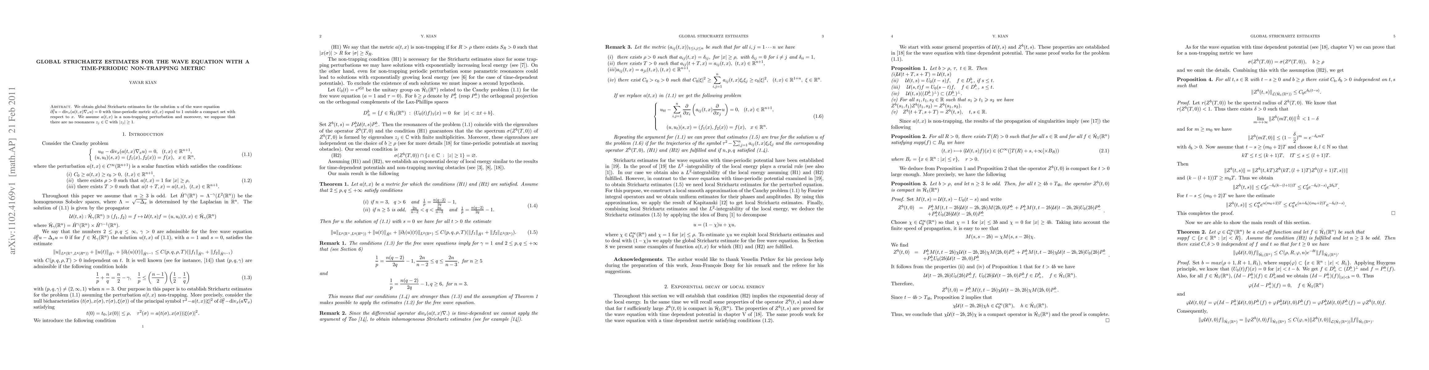 This paper establishes global Strichartz estimates for the wave equation under a time-periodic non-trapping metric, demonstrating the behavior of solutions in the presence of a small perturbation outside a compact set. The analysis excludes resonances with magnitudes greater than or equal to 1.