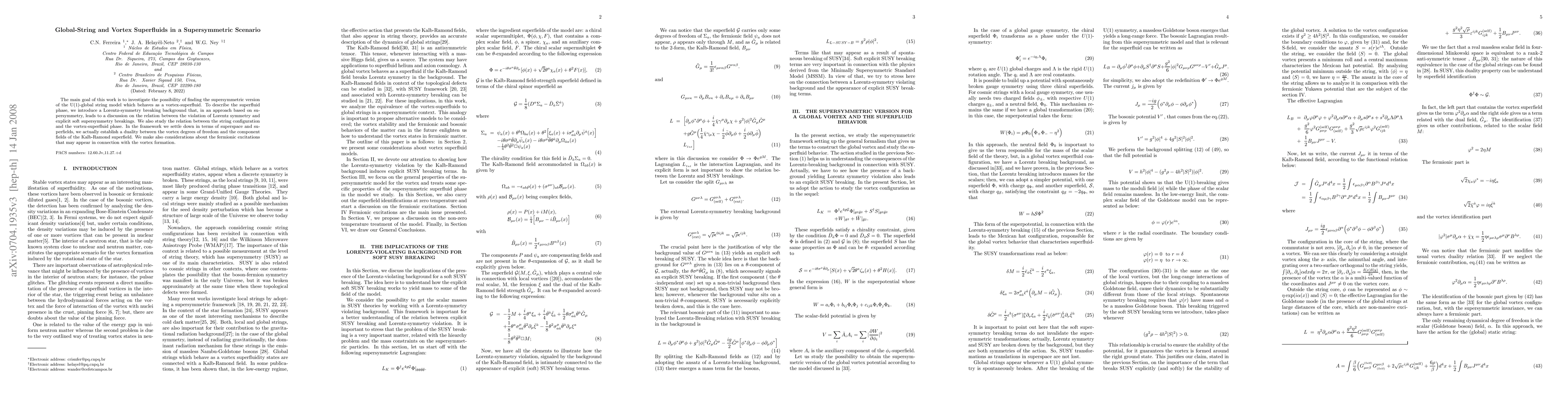 The main goal of this work is to investigate the possibility of finding the supersymmetric version of the U(1)-global string model which behaves as a vortex-superfluid. To describe the superfluid phase, we introduce a Lorentz-symmetry breaking background that, in an approach based on supersymmetry, leads to a discussion on the relation between the violation of Lorentz symmetry and explicit soft supersymmetry breakings. We also study the relation between the string configuration and the vortex-superfluid phase. In the framework we settle down in terms of superspace and superfields, we actually establish a duality between the vortex degrees of freedom and the component fields of the Kalb-Ramond superfield. We make also considerations about the fermionic excitations that may appear in connection with the vortex formation.
