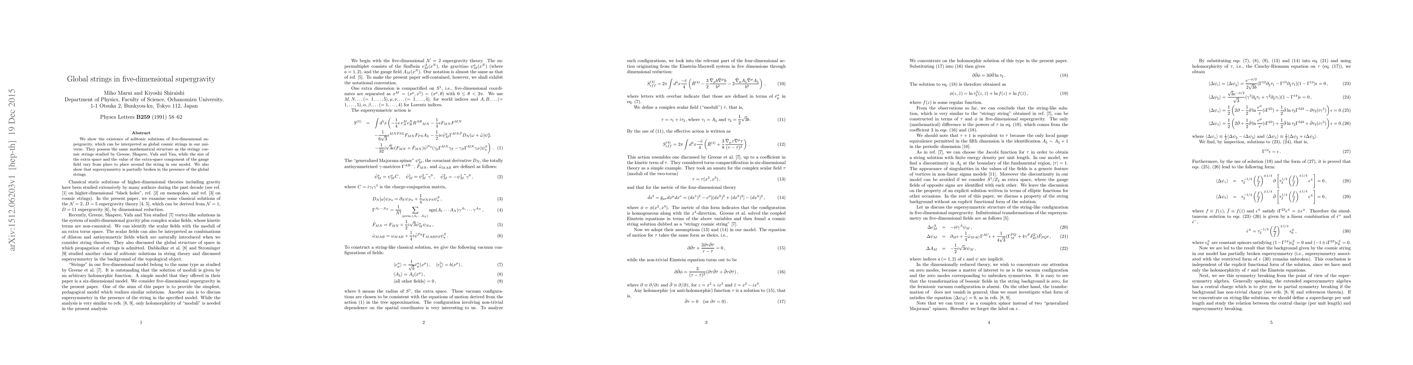 This paper demonstrates the existence of solitonic solutions in five-dimensional supergravity, interpreted as global cosmic strings, with varying extra-space size and gauge field components. It also reveals partial supersymmetry breaking in the presence of these strings.