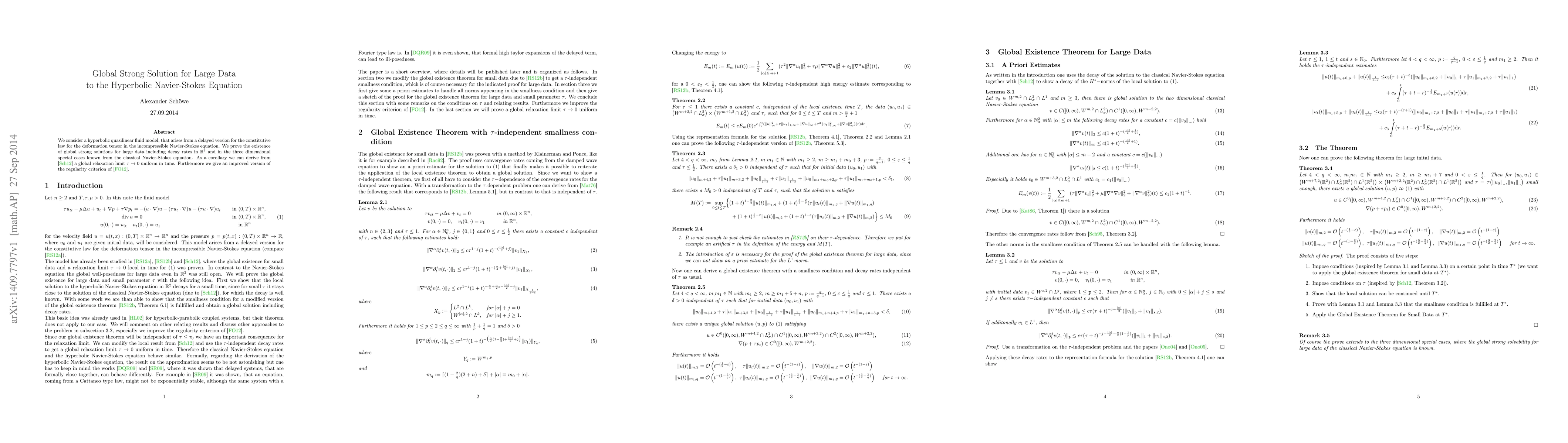 We consider a hyperbolic quasilinear fluid model, that arises from a delayed version for the constitutive law for the deformation tensor in the incompressible Navier-Stokes equation. We prove the existence of global strong solutions for large data including decay rates in $\mathbb{R}^2$ and in the three dimensional special cases known from the classical Navier-Stokes equation. As a corollary we can derive from [Sch12] a global relaxation limit $\tau \to 0$ uniform in time. Furthermore we give an improved version of the regularity criterion of [FO12].