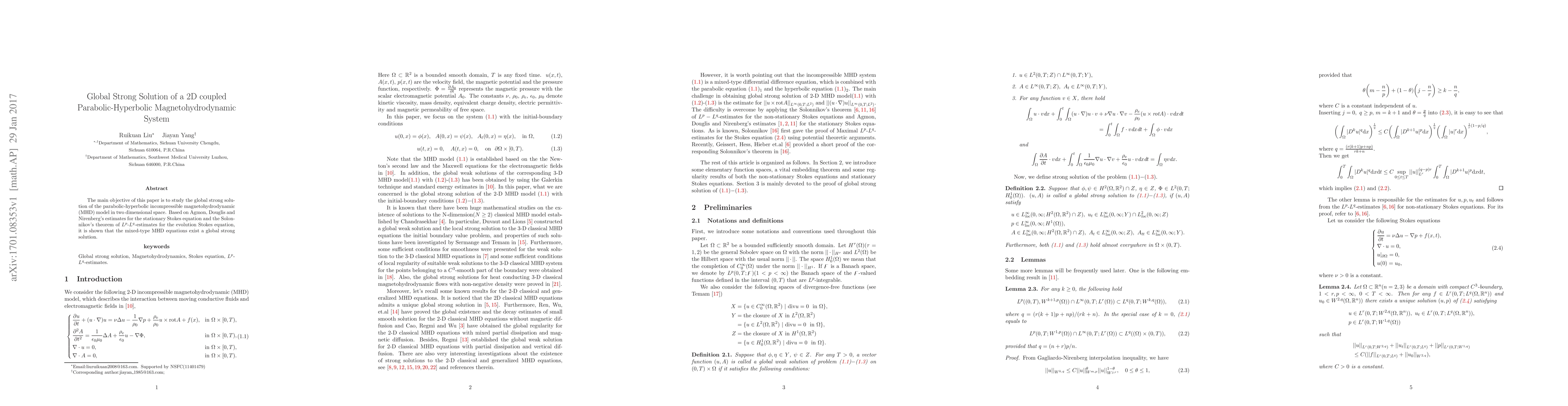 The paper proves the existence of a global strong solution to a 2D coupled Parabolic-Hyperbolic Magnetohydrodynamic system using estimates from Agmon, Douglis and Nirenberg's work and Solonnikov's theorem, demonstrating the model's solvability.