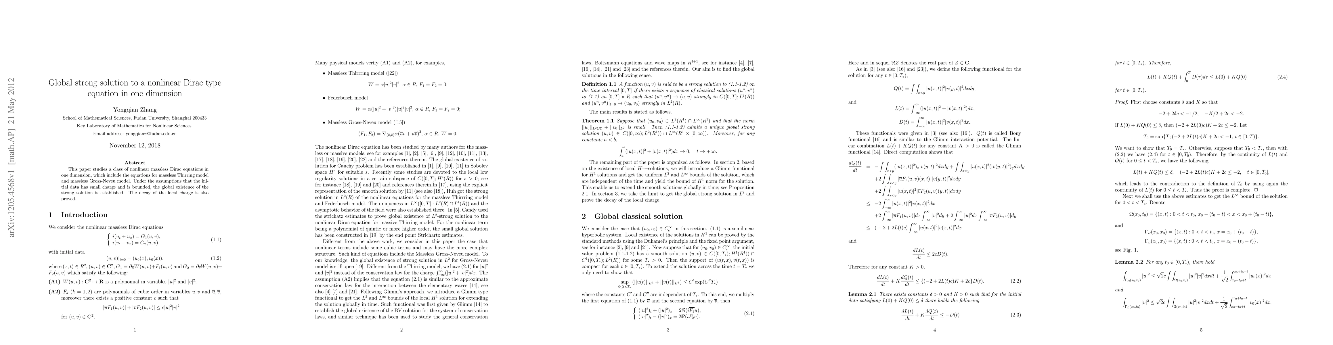 This paper establishes the global existence of a strong solution to a class of nonlinear massless Dirac equations in one dimension, including the massless Thirring and Gross-Neveu models, under small charge and bounded initial data conditions. Additionally, it proves the decay of the local charge.