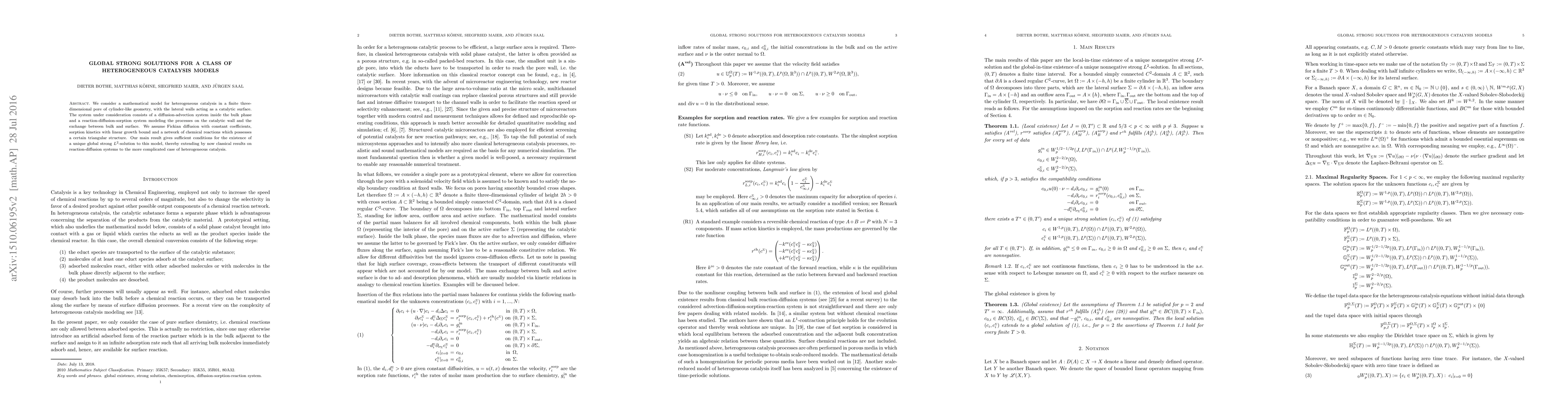 We consider a mathematical model for heterogeneous catalysis in a finite three-dimensional pore of cylinder-like geometry, with the lateral walls acting as a catalytic surface. The system under consideration consists of a diffusion-advection system inside the bulk phase and a reaction-diffusion-sorption system modeling the processes on the catalytic wall and the exchange between bulk and surface. We assume Fickian diffusion with constant coefficients, sorption kinetics with linear growth bound and a network of chemical reactions which possesses a certain triangular structure. Our main result gives sufficient conditions for the existence of a unique global strong $L^2$-solution to this model, thereby extending by now classical results on reaction-diffusion systems to the more complicated case of heterogeneous catalysis.