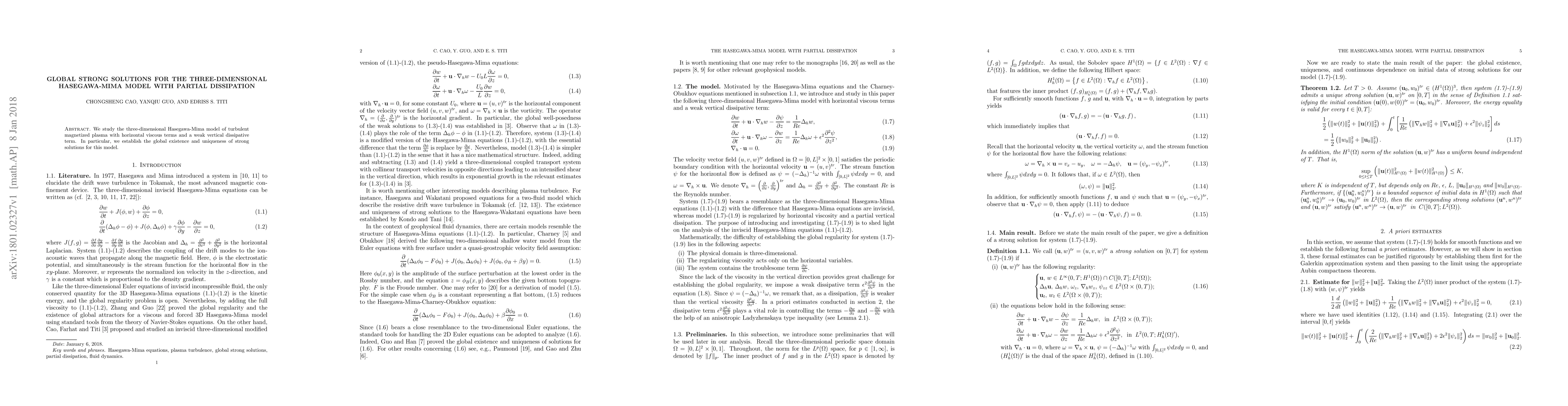 This paper establishes the global existence and uniqueness of strong solutions for the three-dimensional Hasegawa-Mima model, which describes turbulent magnetized plasma with horizontal viscosity and weak vertical dissipation. The results demonstrate the model's stability under these conditions.