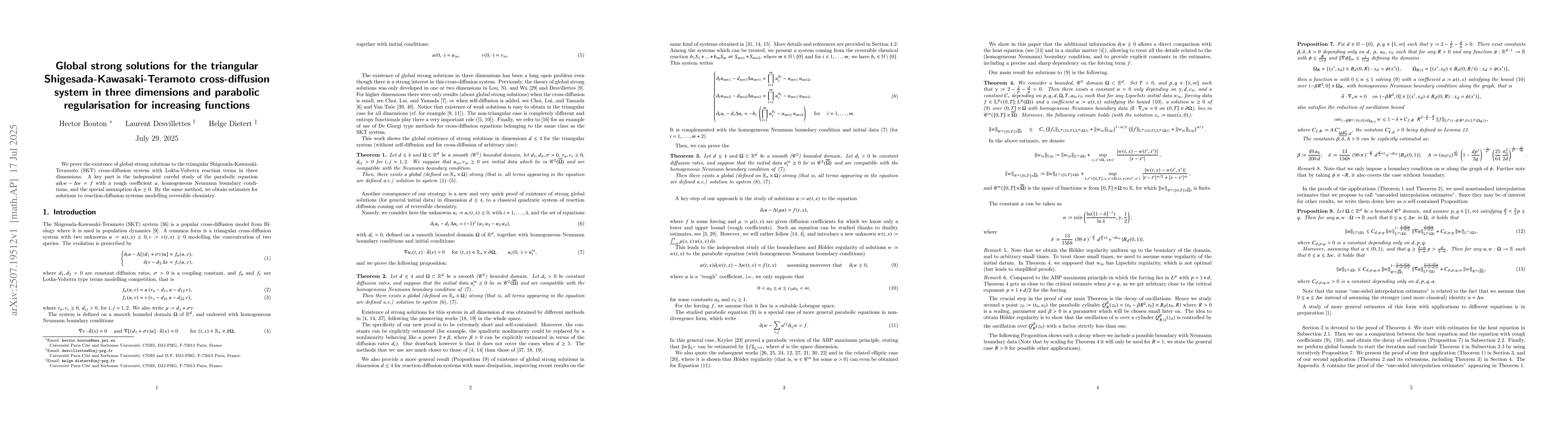 We prove the existence of global strong solutions to the triangular Shigesada-Kawasaki-Teramoto (SKT) cross-diffusion system with Lokta-Volterra reaction terms in three dimensions. A key part is the independent careful study of the parabolic equation $a\partial_t w - \Delta w = f$ with a rough coefficient $a$, homogeneous Neumann boundary conditions, and the special assumption $\partial_t w \ge 0$. By the same method, we obtain estimates for solutions to reaction-diffusion systems modelling reversible chemistry.
