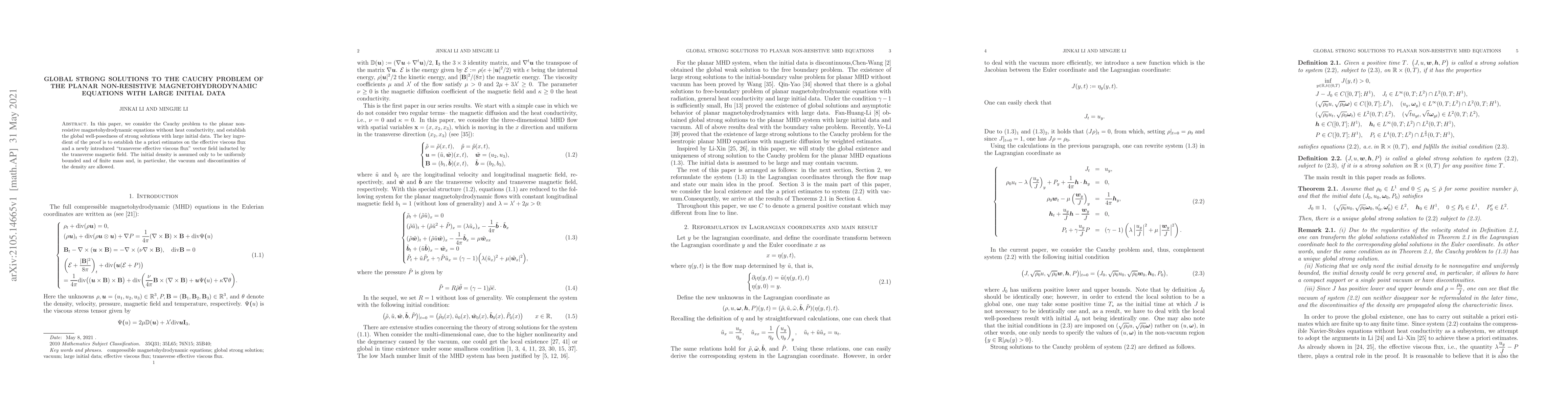 This paper establishes global strong solutions for the planar non-resistive magnetohydrodynamic equations with large initial data, allowing for vacuum and density discontinuities. The proof relies on a priori estimates for the effective viscous flux and a new "transverse effective viscous flux" vector field.