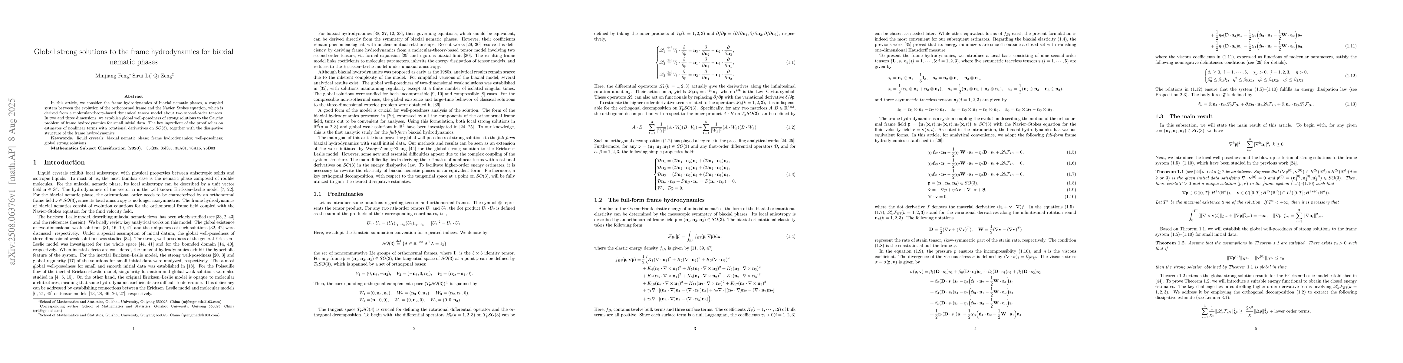 In this article, we consider the frame hydrodynamics of biaxial nematic phases, a coupled system between the evolution of the orthonormal frame and the Navier--Stokes equation, which is derived from a molecular-theory-based dynamical tensor model about two second-order tensors. In two and three dimensions, we establish global well-posedness of strong solutions to the Cauchy problem of frame hydrodynamics for small initial data. The key ingredient of the proof relies on estimates of nonlinear terms with rotational derivatives on $SO(3)$, together with the dissipative structure of the frame hydrodynamics.