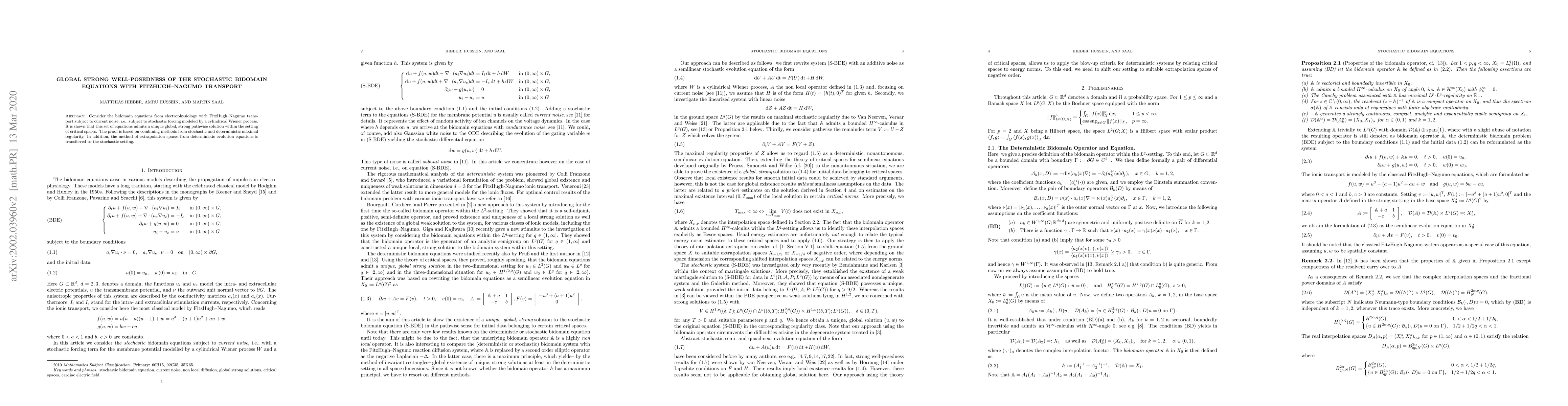 Consider the bidomain equations from electrophysiology with FitzHugh--Nagumo transport subject to current noise, i.e., subject to stochastic forcing modeled by a cylindrical Wiener process. It is shown that this set of equations admits a unique global, strong pathwise solution within the setting of critical spaces. The proof is based on combining methods from stochastic and deterministic maximal regularity. In addition, the method of extrapolation spaces from deterministic evolution equations is transferred to the stochastic setting.