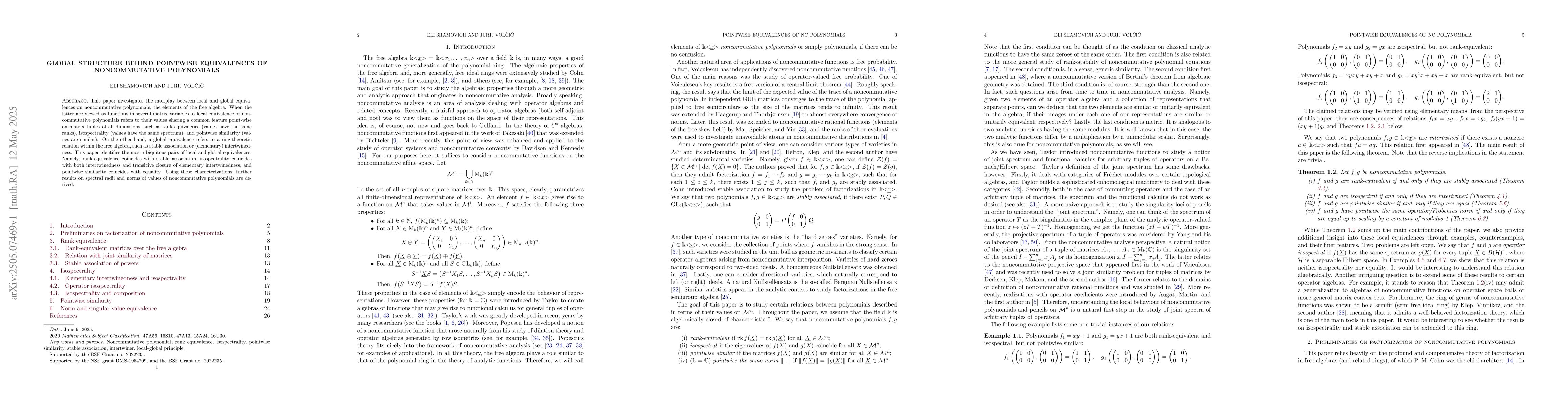 The paper explores local and global equivalences of noncommutative polynomials in the free algebra, viewed as functions in matrix variables, employing concepts like rank-equivalence, isospectrality, pointwise similarity, stable association, and intertwinedness.