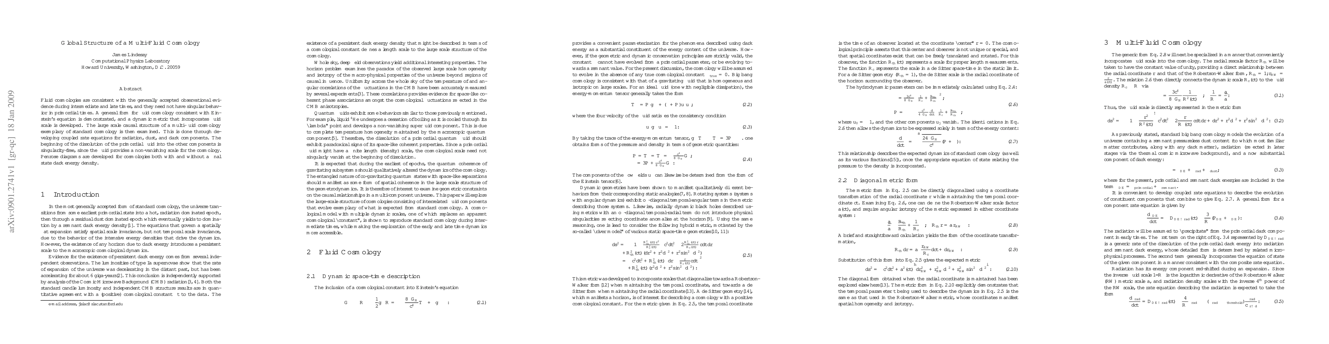 This paper develops a multi-fluid cosmology model consistent with Einstein's equations, demonstrating a dynamic metric that avoids singularities in primordial times. It examines the large-scale causal structure through coupled rate equations for radiation, dust, and dark matter, and presents Penrose diagrams for cosmologies with and without dark energy.
