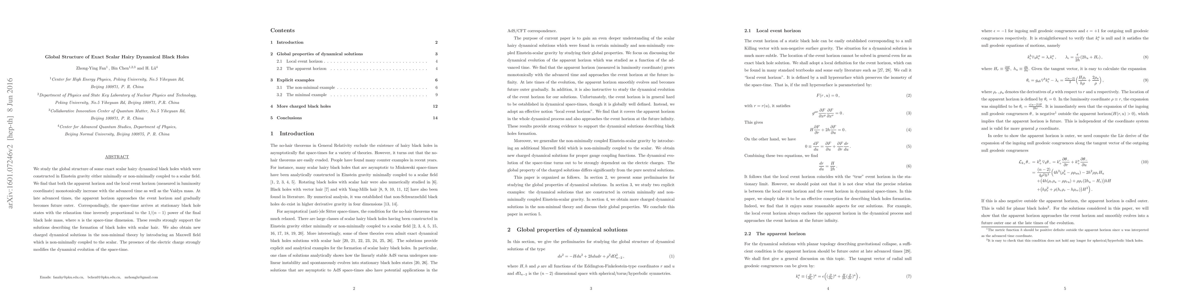We study the global structure of some exact scalar hairy dynamical black holes which were constructed in Einstein gravity either minimally or non-minimally coupled to a scalar field. We find that both the apparent horizon and the local event horizon (measured in luminosity coordinate) monotonically increase with the advanced time as well as the Vaidya mass. At late advanced times, the apparent horizon approaches the event horizon and gradually becomes future outer. Correspondingly, the space-time arrives at stationary black hole states with the relaxation time inversely proportional to the $1/(n-1)$ power of the final black hole mass, where $n$ is the space-time dimension. These results strongly support the solutions describing the formation of black holes with scalar hair. We also obtain new charged dynamical solutions in the non-minimal theory by introducing an Maxwell field which is non-minimally coupled to the scalar. The presence of the electric charge strongly modifies the dynamical evolution of the space-time.