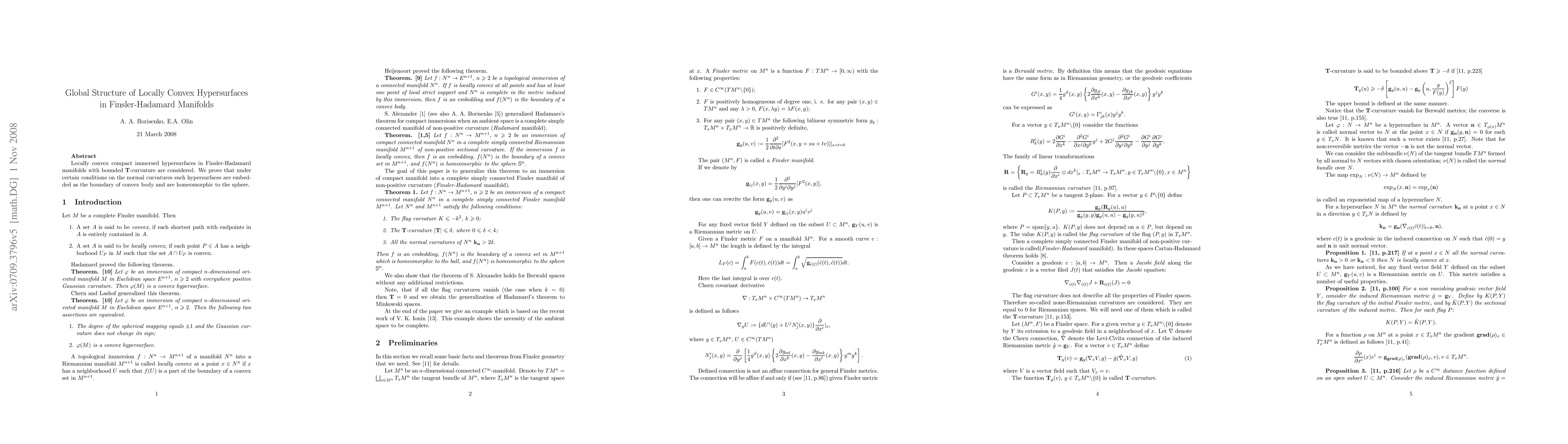 Locally convex compact immersed hypersurfaces in Finsler-Hadamard manifolds with bounded T-curvature are considered. We prove that such hypersurfaces are embedded as the boundary of convex body under certain conditions on the normal curvatures