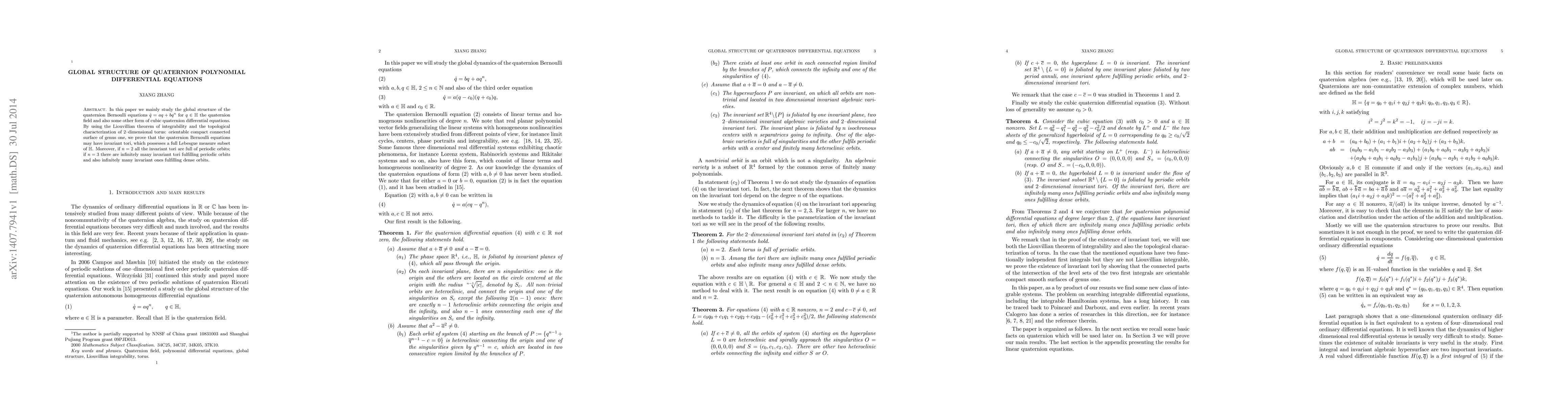 In this paper we mainly study the global structure of the quaternion Bernoulli equations $\dot q=aq+bq^n$ for $q\in \mathbb H$ the quaternion field and also some other form of cubic quaternion differential equations. By using the Liouvillian theorem of integrability and the topological characterization of $2$--dimensional torus: orientable compact connected surface of genus one, we prove that the quaternion Bernoulli equations may have invariant tori, which possesses a full Lebesgue measure subset of $\mathbb H$. Moreover, if $n=2$ all the invariant tori are full of periodic orbits; if $n=3$ there are nfiinitely many invariant tori fulfilling periodic orbits and also infinitely many invariant ones fulfilling dense orbits.