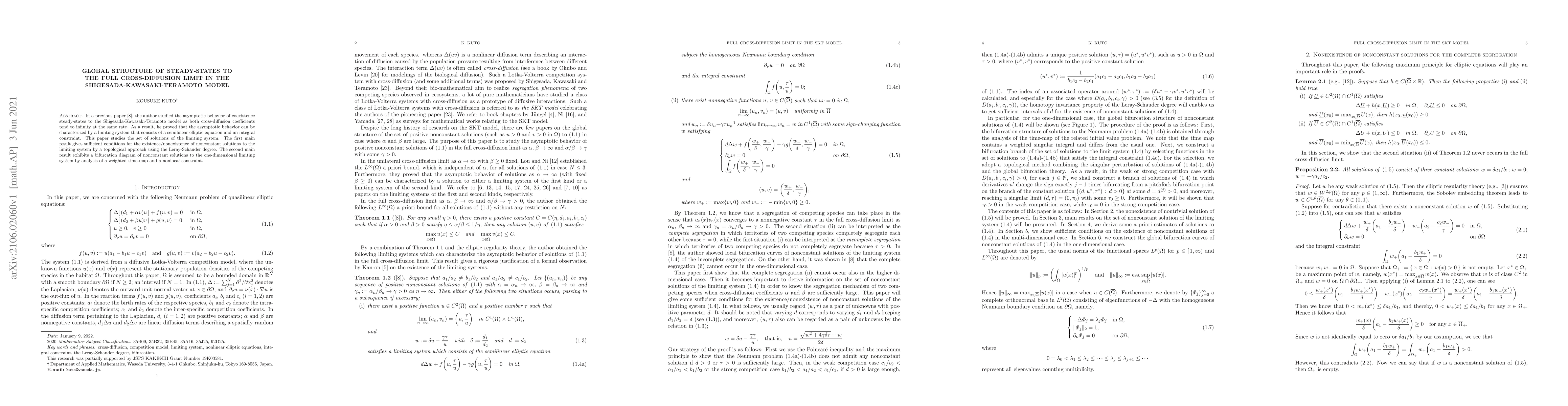This paper explores the steady-state solutions of the full cross-diffusion limit in the Shigesada-Kawasaki-Teramoto model, proving conditions for their existence/nonexistence via topological methods and presenting a bifurcation diagram for nonconstant solutions using a weighted time-map and nonlocal constraint analysis.