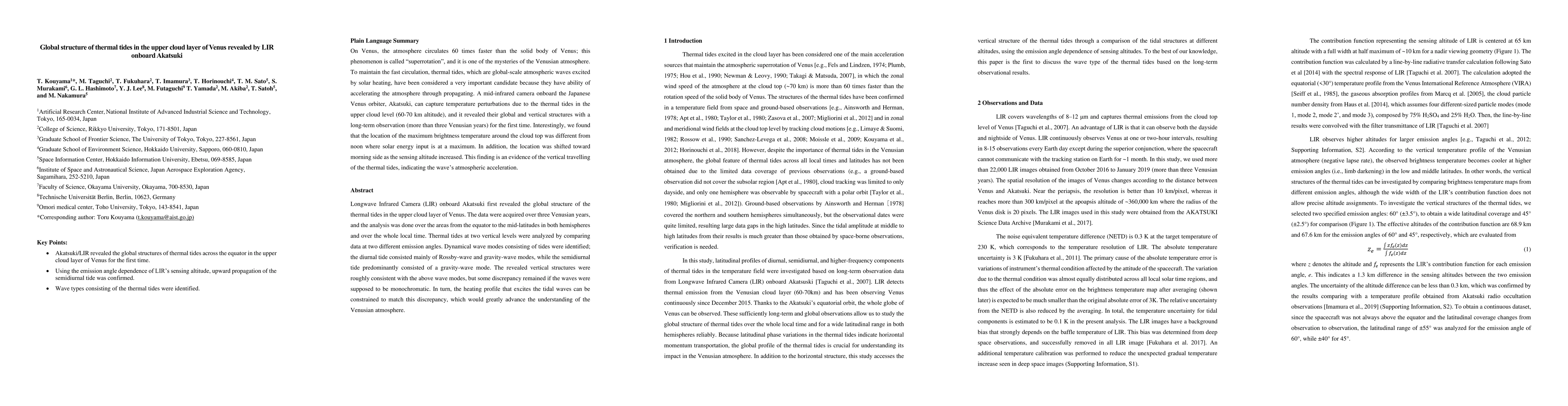 Longwave Infrared Camera (LIR) onboard Akatsuki first revealed the global structure of the thermal tides in the upper cloud layer of Venus. The data were acquired over three Venusian years, and the analysis was done over the areas from the equator to the mid-latitudes in both hemispheres and over the whole local time. Thermal tides at two vertical levels were analyzed by comparing data at two different emission angles. Dynamical wave modes consisting of tides were identified; the diurnal tide consisted mainly of Rossby-wave and gravity-wave modes, while the semidiurnal tide predominantly consisted of a gravity-wave mode. The revealed vertical structures were roughly consistent with the above wave modes, but some discrepancy remained if the waves were supposed to be monochromatic. In turn, the heating profile that excites the tidal waves can be constrained to match this discrepancy, which would greatly advance the understanding of the Venusian atmosphere.