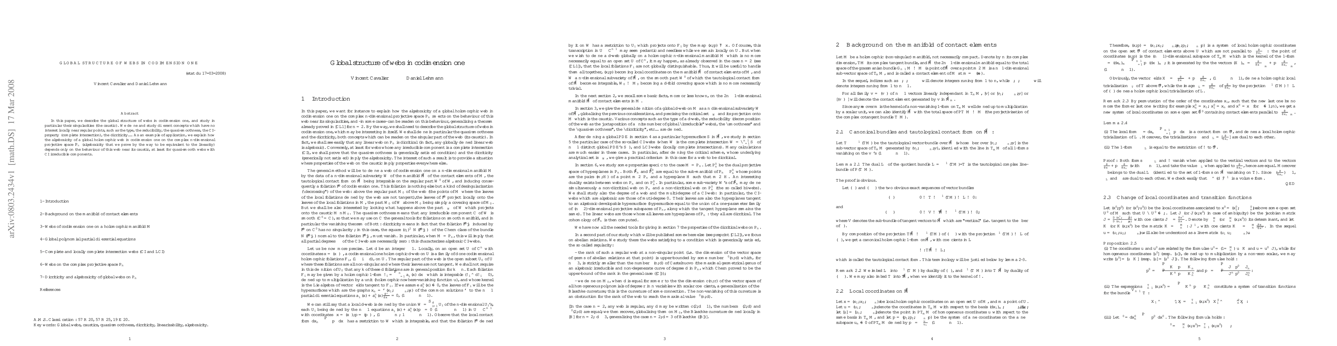 We describe the global structure of holomorphic webs in codimension one, and in particular their singularity (caustic). Various concepts are introduced, which have no interest locally near a regular point, such as the type, the reducibility, the quasi-smoothness, the CI property (complete intersection), the dicriticity... We prove for instance that the algebraicity of a web globally defined on a complex projective space may be readen on its caustic (dicriticity), at least if each irreducible component is CI, and the web quasi-smooth. .