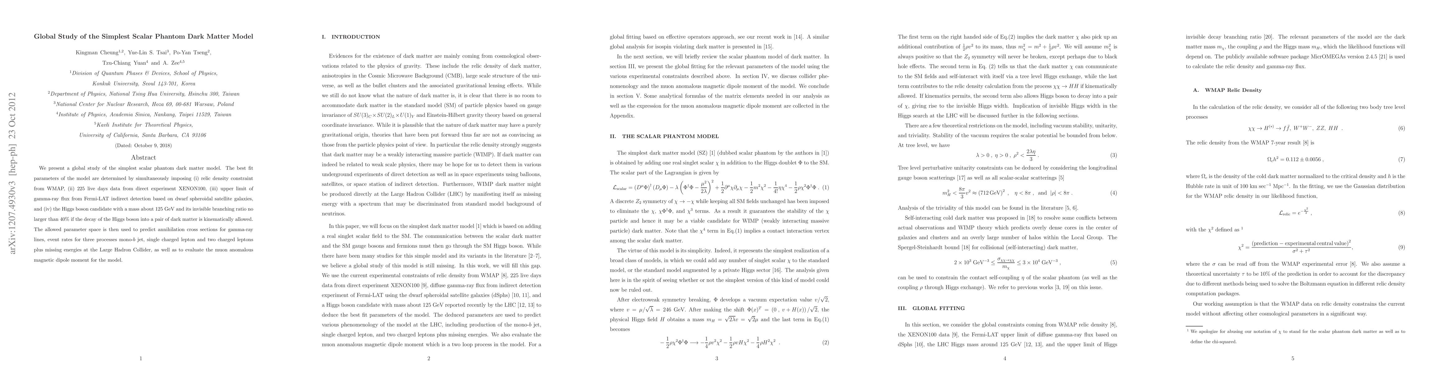 We present a global study of the simplest scalar phantom dark matter model. The best fit parameters of the model are determined by simultaneously imposing (i) relic density constraint from WMAP, (ii) 225 live days data from direct experiment XENON100, (iii) upper limit of gamma-ray flux from Fermi-LAT indirect detection based on dwarf spheroidal satellite galaxies, and (iv) the Higgs boson candidate with a mass about 125 GeV and its invisible branching ratio no larger than 40% if the decay of the Higgs boson into a pair of dark matter is kinematically allowed. The allowed parameter space is then used to predict annihilation cross sections for gamma-ray lines, event rates for three processes mono-b jet, single charged lepton and two charged leptons plus missing energies at the Large Hadron Collider, as well as to evaluate the muon anomalous magnetic dipole moment for the model.