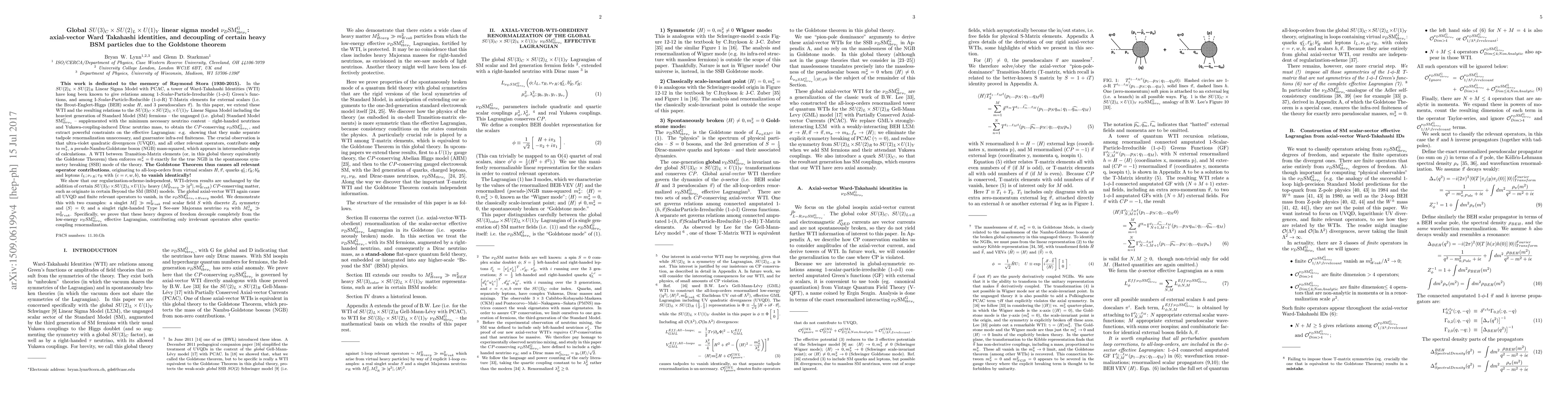 Dedicated to the memory of Raymond Stora (1930-2015). In the $SU(2)_L\times SU(2)_R$ Linear Sigma Model with PCAC, towers of Ward-Takahashi Identities (WTI) have long been known to give relations among 1-Scalar-Particle-Irreducible Green's functions, and among I- Scalar-Particle-Reducible T-Matrix elements, for external scalars (i.e. the Brout-Englert-Higgs scalar and 3 pseudoscalars). We extend these WTI and the resulting relations to the $SU(3)_C\times SU(2)_L\times U(1)_Y$ Linear Sigma Model including the heaviest generation of Standard Model (SM) fermions supplemented with the minimum necessary neutrino content -- right-handed neutrinos and Yukawa-coupling-induced Dirac neutrino mass. We extract powerful constraints on the effective Lagrangian: e.g. showing that they make separate tadpole renormalization unnecessary, and guarantee infra-red finiteness. Crucially, ultra-violet quadratic divergences (UVQD) and all other relevant operators contribute only to $m_\pi^2$, a Nambu-Goldstone boson (NGB) mass-squared. A WTI between T-Matrix elements (i.e. the Goldstone Theorem) then enforces $ m_\pi^2=0$ for the true NGB in the spontaneous symmetry breaking mode of the theory. All relevant operator contributions originating to all-loop-orders from virtual scalars, quarks and leptons, vanish identically! Our regularization-scheme-independent results are unchanged by the addition of certain heavy CP-conserving matter, such as originate in certain Beyond the SM models. We demonstrate this with two examples: a heavy singlet real scalar field with $Z_2$ symmetry and no VEV; and a heavy singlet right-handed Type I See-saw Majorana neutrino. Specifically, we prove that these heavy degrees of freedom decouple completely from the low-energy effective Lagrangian, contributing only irrelevant operators after quartic-coupling renormalization.