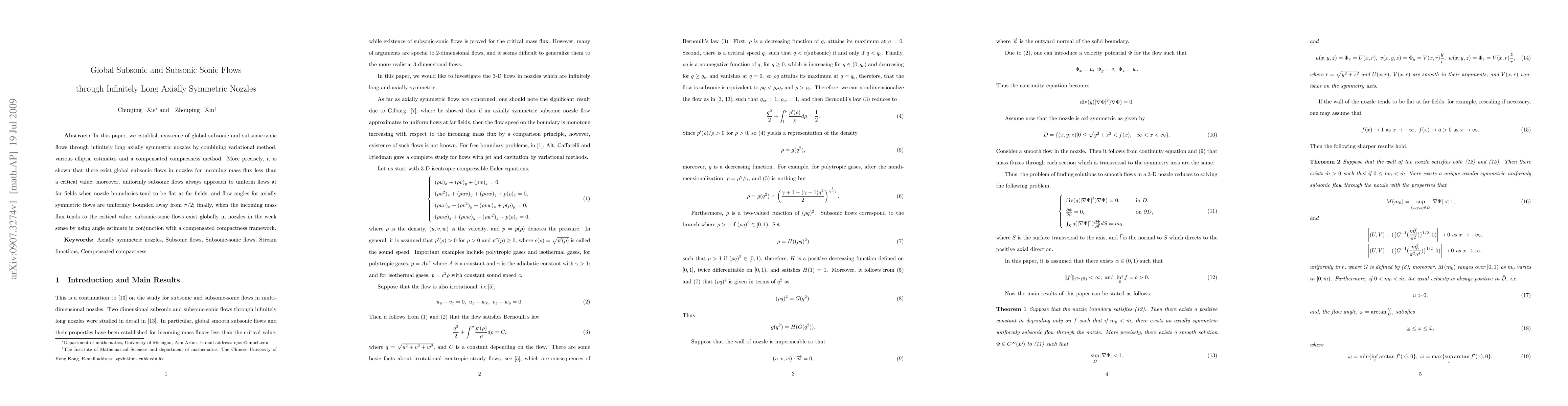 In this paper, we establish existence of global subsonic and subsonic-sonic flows through infinitely long axially symmetric nozzles by combining variational method, various elliptic estimates and a compensated compactness method. More precisely, it is shown that there exist global subsonic flows in nozzles for incoming mass flux less than a critical value; moreover, uniformly subsonic flows always approach to uniform flows at far fields when nozzle boundaries tend to be flat at far fields, and flow angles for axially symmetric flows are uniformly bounded away from $\pi/2$; finally, when the incoming mass flux tends to the critical value, subsonic-sonic flows exist globally in nozzles in the weak sense by using angle estimate in conjunction with a compensated compactness framework.