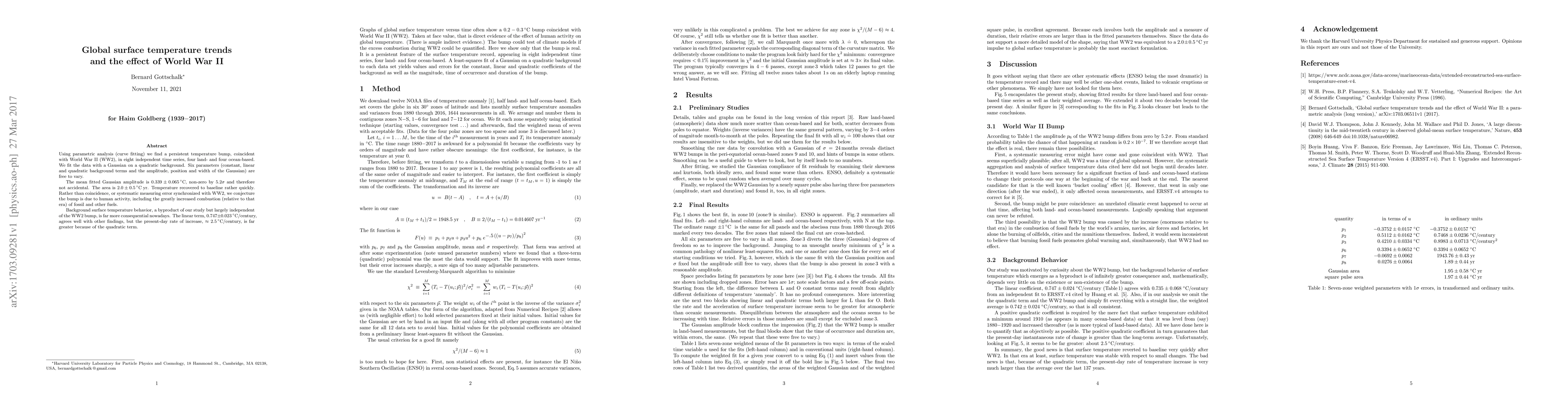Using parametric analysis (curve fitting) we find a persistent temperature bump, coincident with World War II (WW2), in eight independent time series, four land- and four ocean-based. We fit the data with a Gaussian on a quadratic background. Six parameters (constant, linear and quadratic background terms and the amplitude, position and width of the Gaussian) are free to vary. The mean fitted Gaussian amplitude is 0.339$\pm$ 0.065$\,^\circ$C, non-zero by 5.2$\sigma$ and therefore not accidental. The area is 2.0$\pm$0.5$\,^\circ$C yr. Temperature recovered to baseline rather quickly. Rather than coincidence, or systematic measuring error synchronized with WW2, we conjecture the bump is due to human activity, including the greatly increased combustion (relative to that era) of fossil and other fuels. Background surface temperature behavior, a byproduct of our study but largely independent of the WW2 bump, is far more consequential nowadays. The linear term, 0.747$\pm$0.023$\,^\circ$C/century, agrees well with other findings, but the present-day rate of increase, $\approx$2.5$\,^\circ$C/century, is far greater because of the quadratic term.